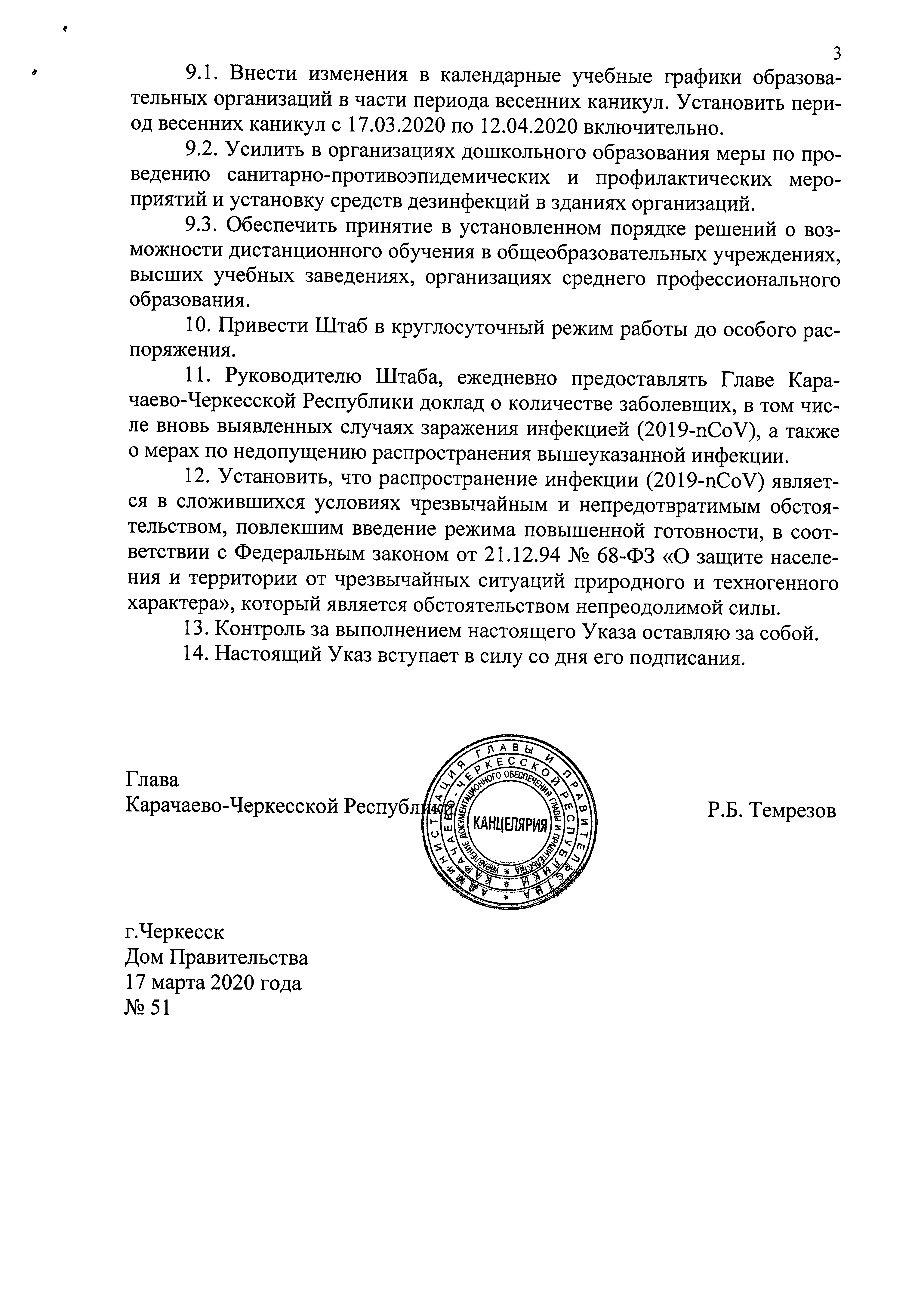 Указ Главы Карачаево-Черкесской Республики от 17.03.2020 № 51
