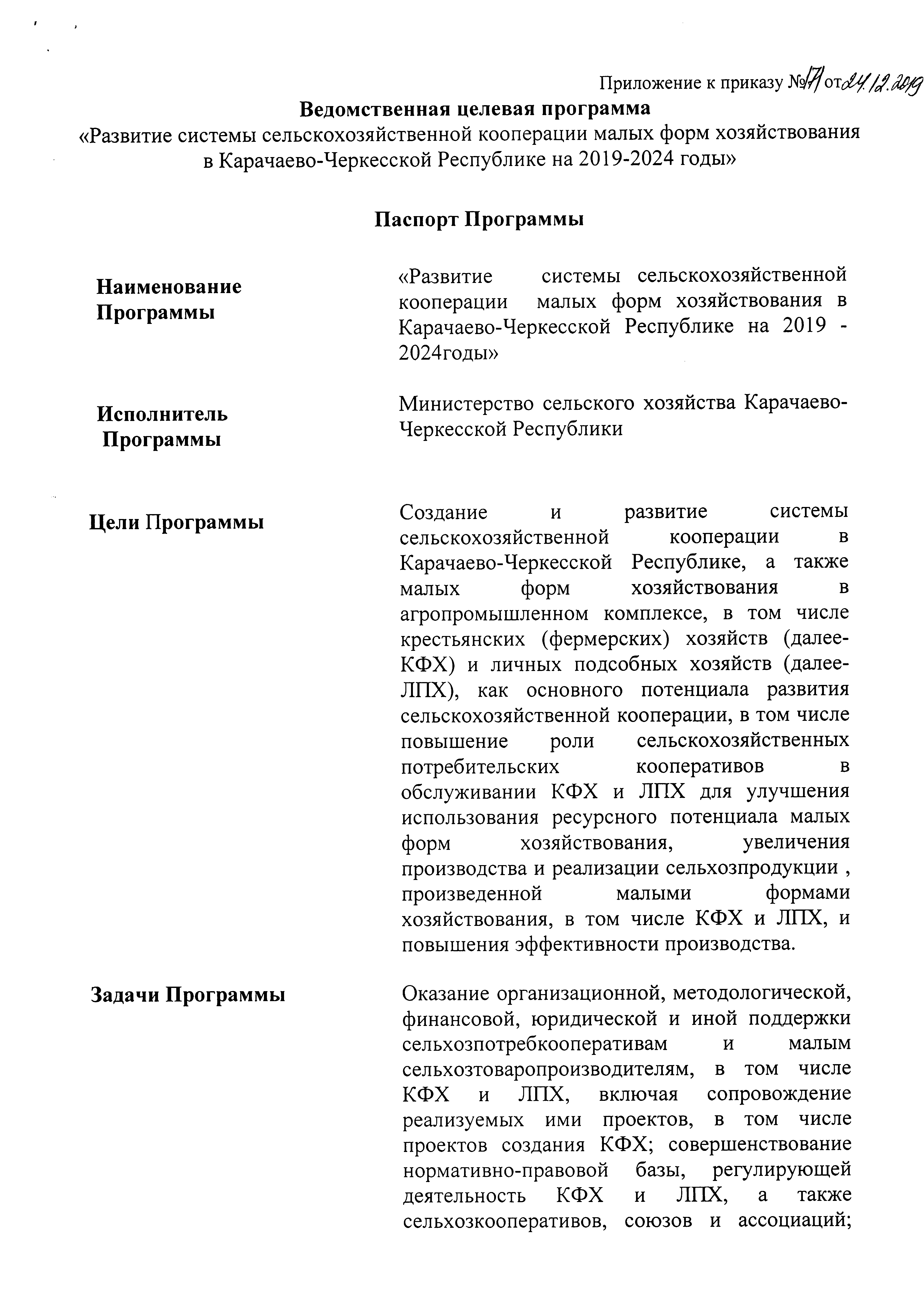 "Об утверждении ведомственной целевой программы "Развитие системы сельскохозяйственной кооперации малых форм хозяйствования в Карачаево-Черкесской Республике на 2019-2024 годы"