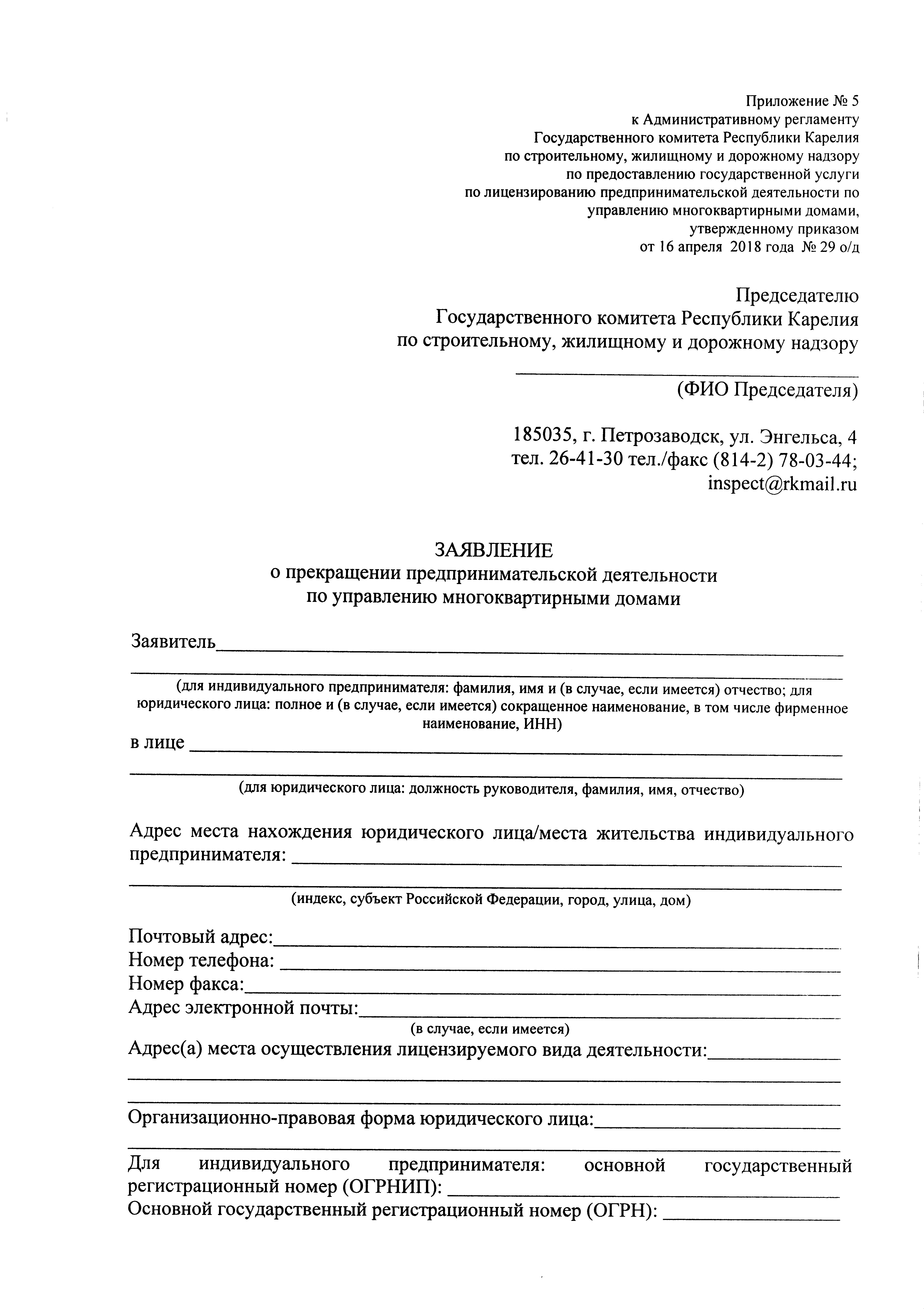 Приказ Государственного комитета Республики Карелия по строительному, жилищному и дорожному надзору от 16.04.2018 № 29 о/д