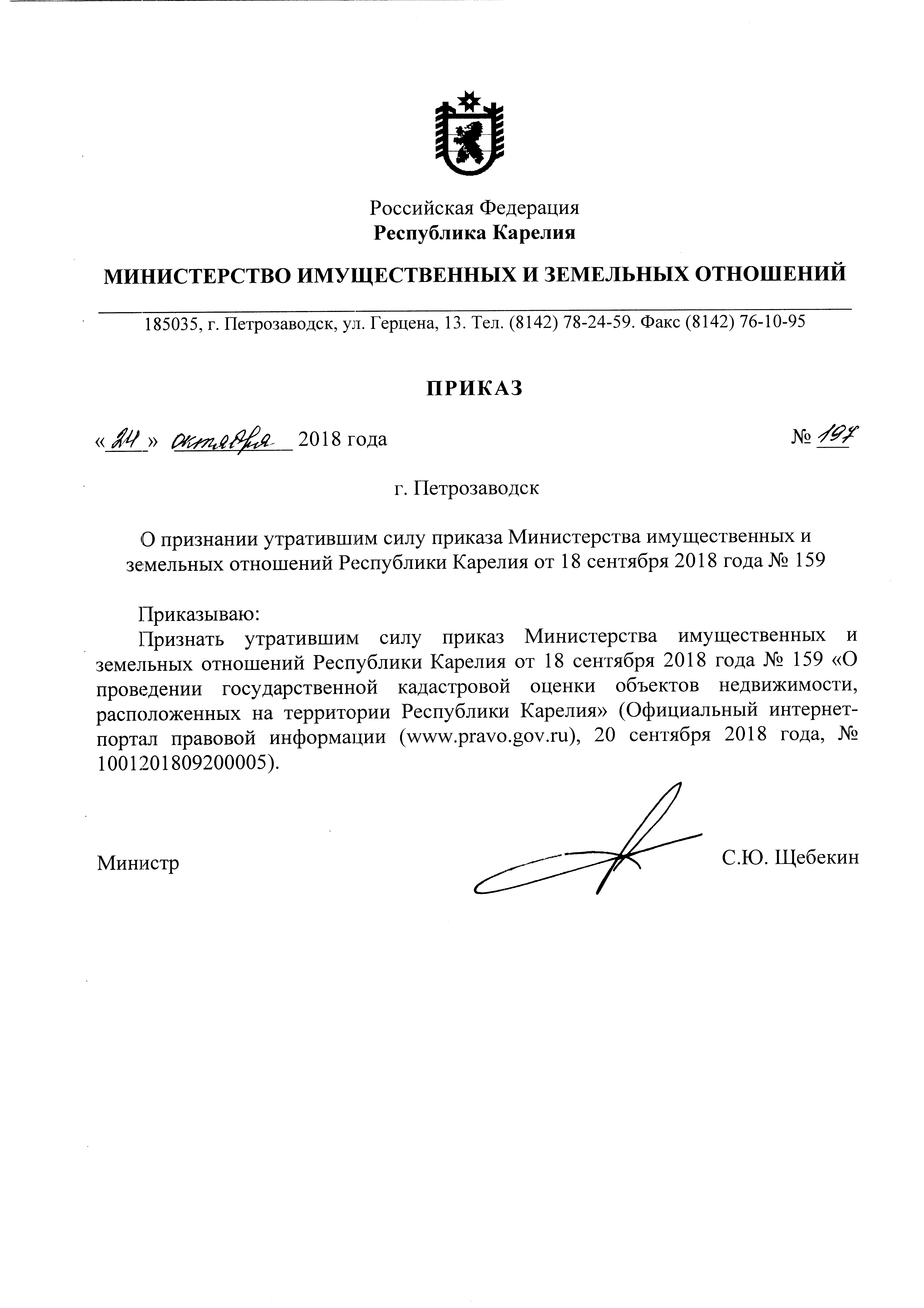 Приказ Министерства имущественных и земельных отношений Республики Карелия от 24.10.2018 № 197