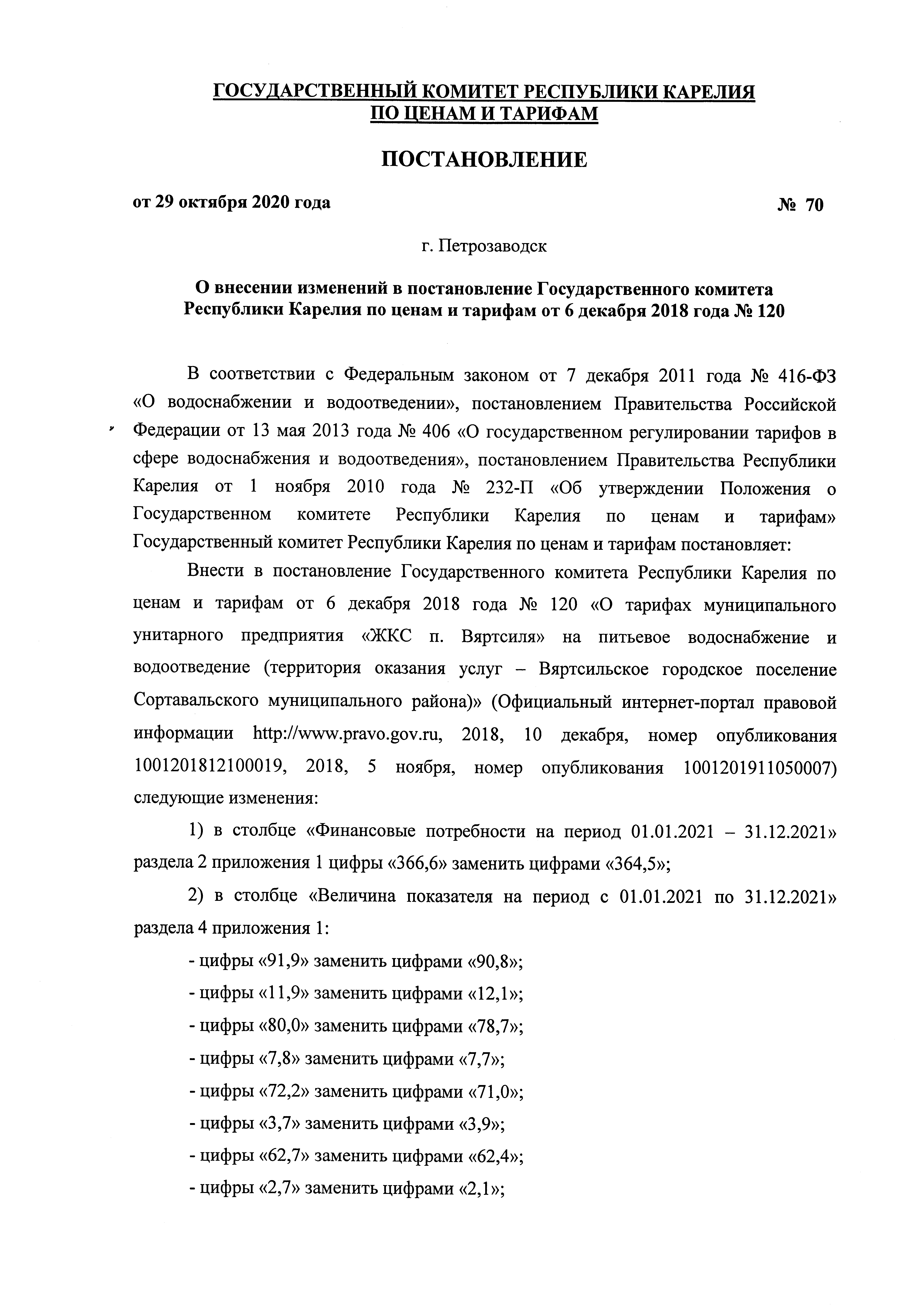 Постановление Государственного комитета Республики Карелия по ценам и тарифам от 29.10.2020 № 70