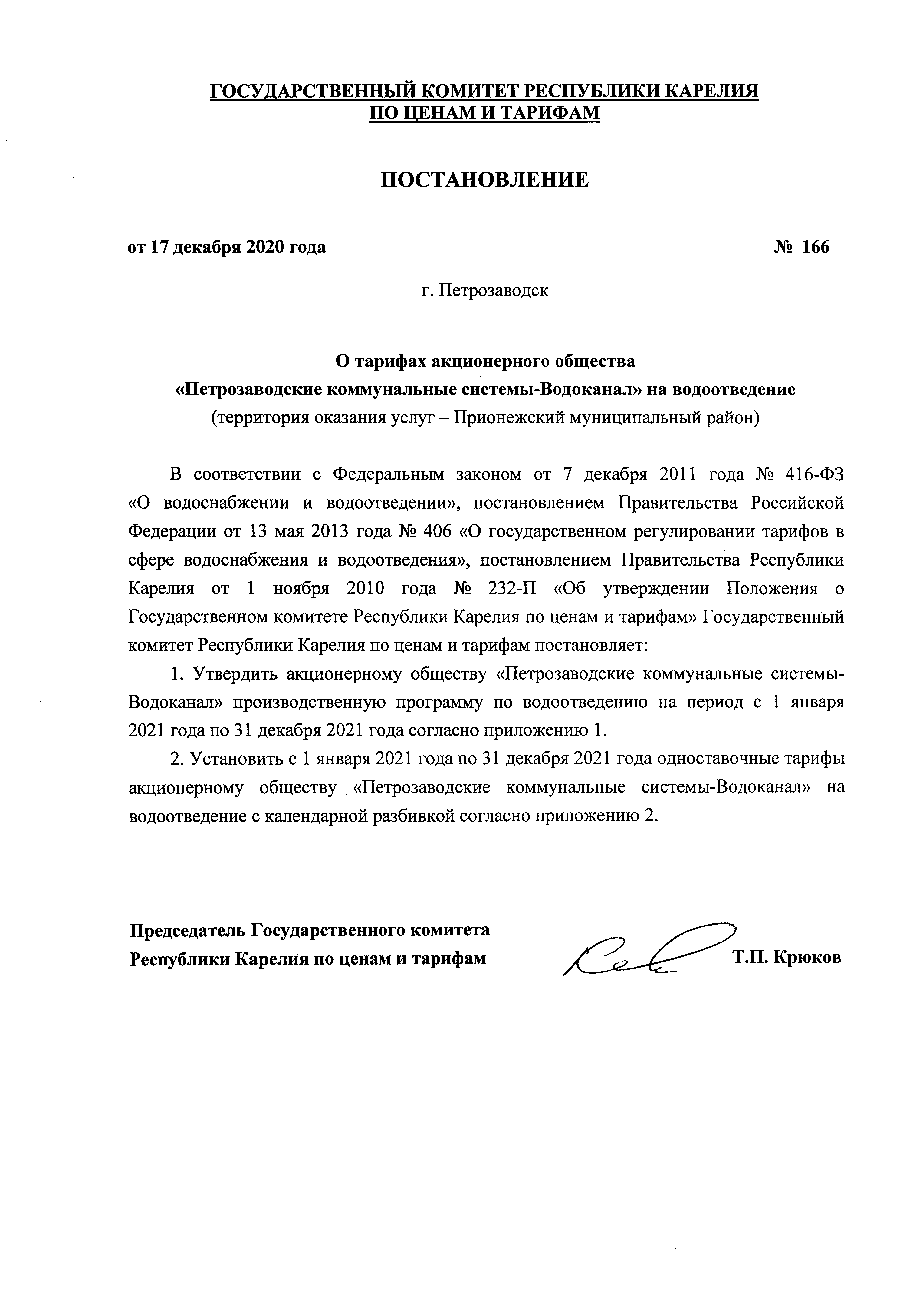 Постановление Государственного комитета Республики Карелия по ценам и тарифам от 17.12.2020 № 166