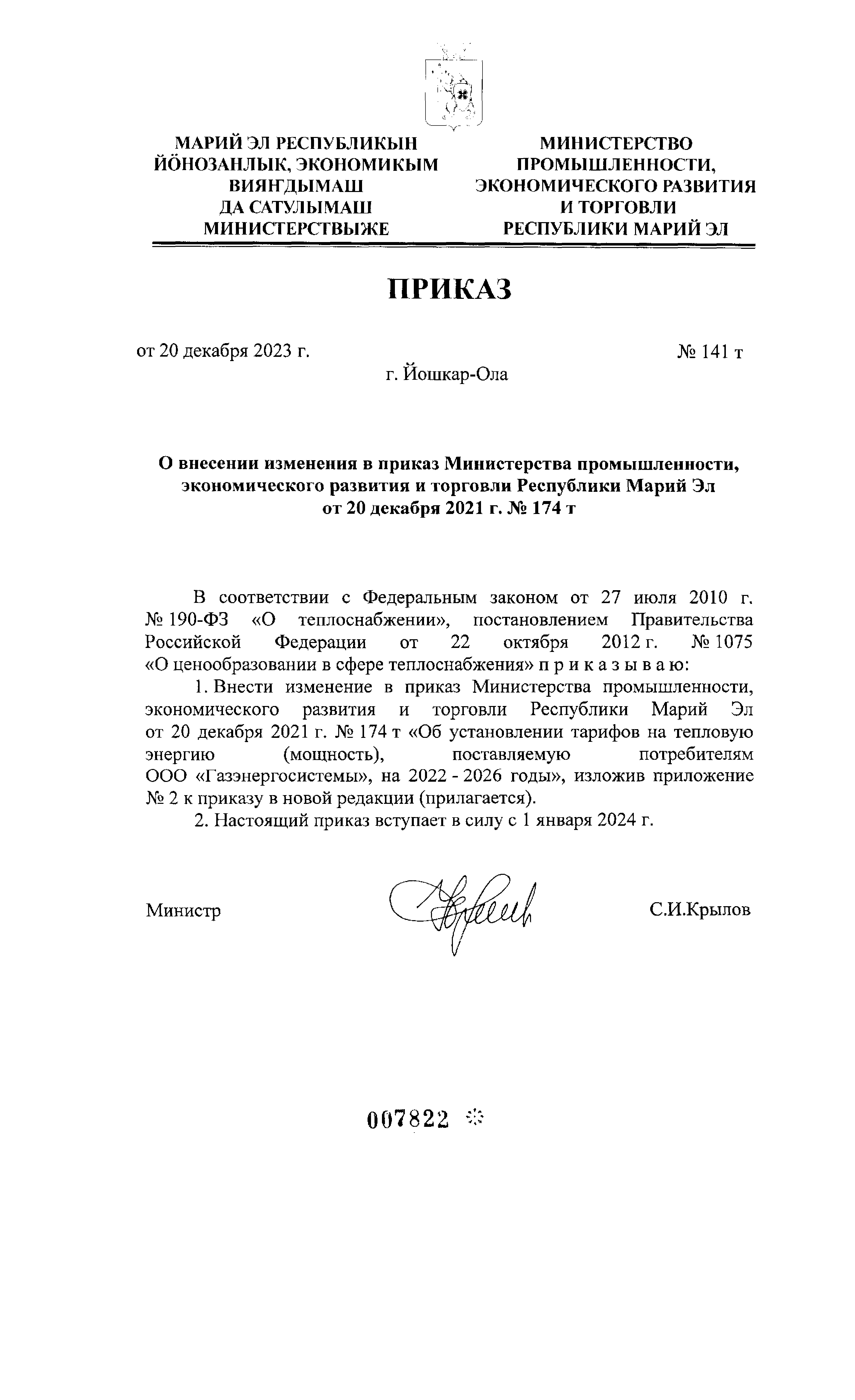 Приказ Министерства промышленности, экономического развития и торговли Республики Марий Эл от 20.12.2023 № 141 т