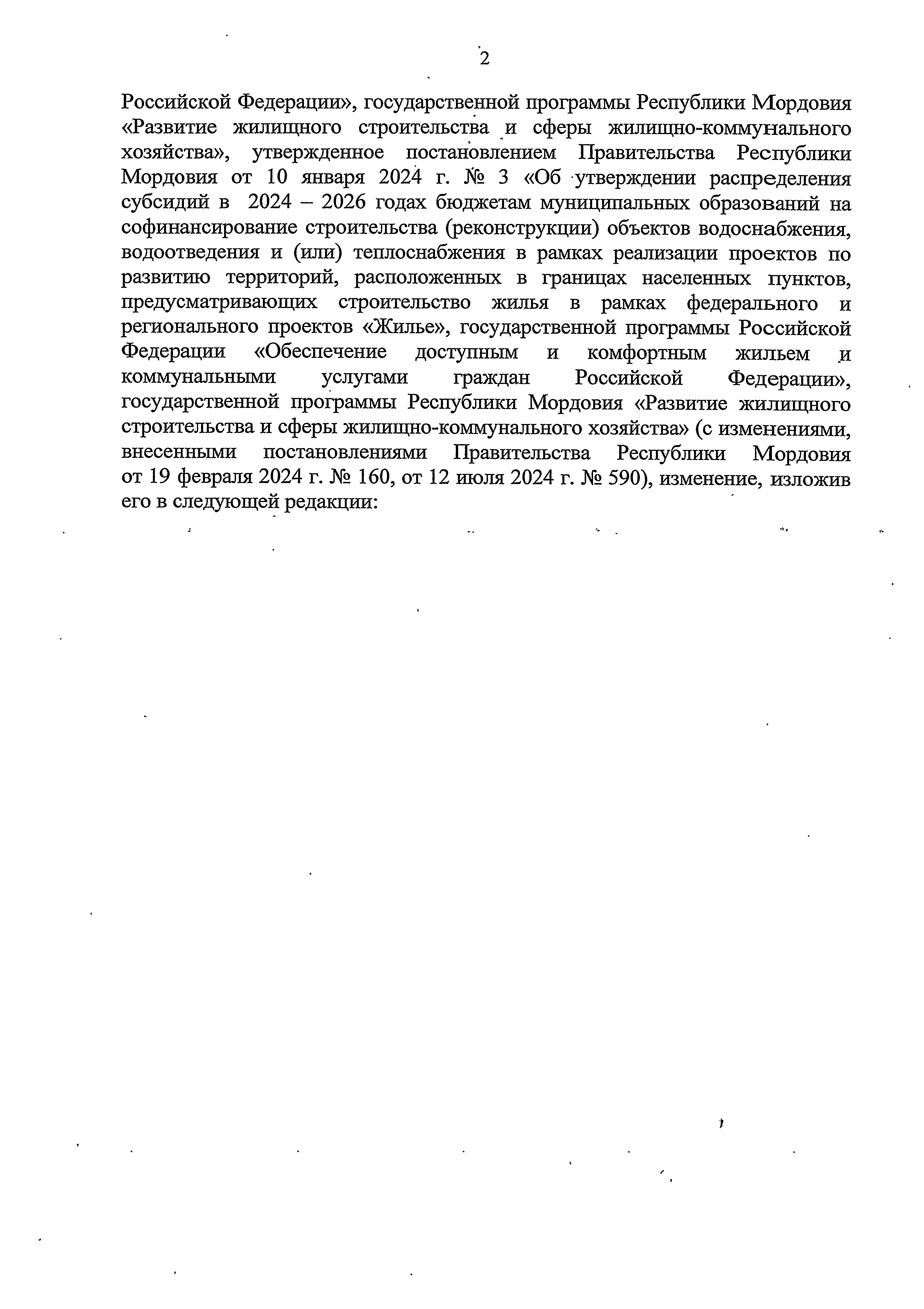"О внесении изменения в распределение субсидий в 2024 – 2026 годах бюджетам муниципальных образований на софинансирование строительства (реконструкции) объектов водоснабжения, водоотведения и (или) теплоснабжения в рамках реализации проектов по развитию территорий, расположенных в границах населенных пунктов, предусматривающих строительство жилья в рамках федерального и регионального проектов "Жилье", государственной программы Российской Федерации "Обеспечение доступным и комфортным жильем и коммунальными услугами граждан Российской Федерации", государственной программы Республики Мордовия "Развитие жилищного строительства и сферы жилищно-коммунального хозяйства"