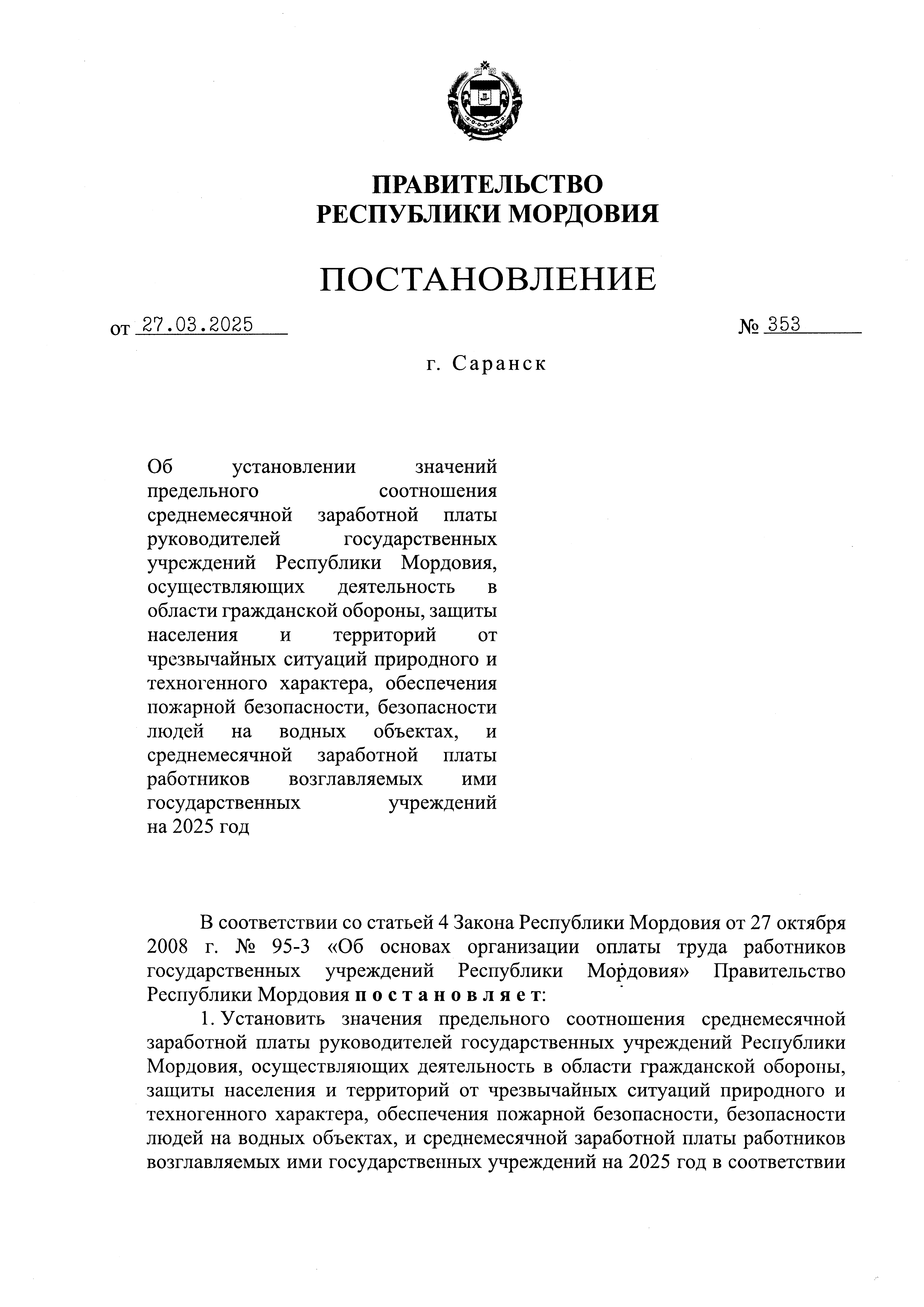 Постановление Правительства Республики Мордовия от 27.03.2025 № 353