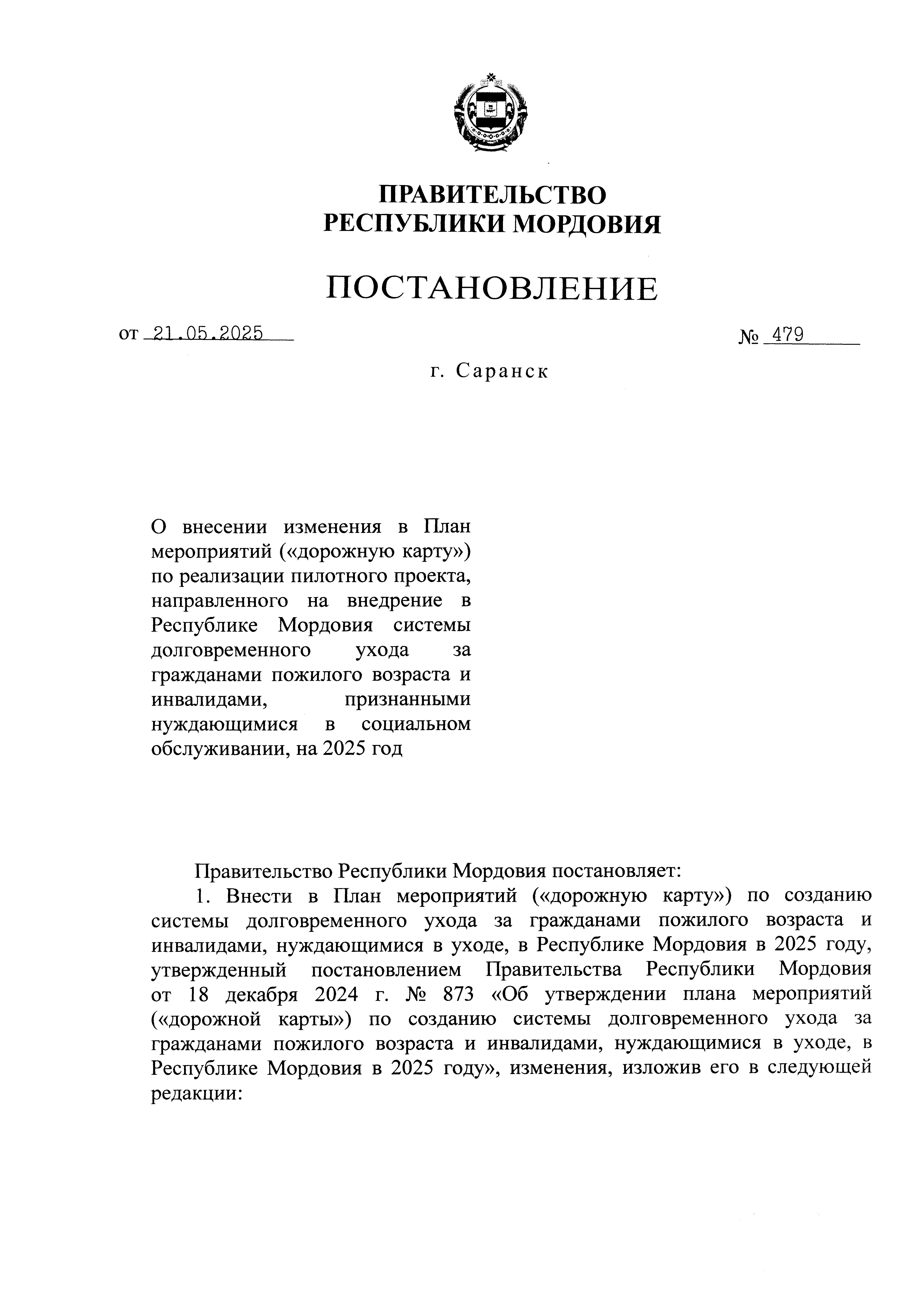 Постановление Правительства Республики Мордовия от 21.05.2025 № 479