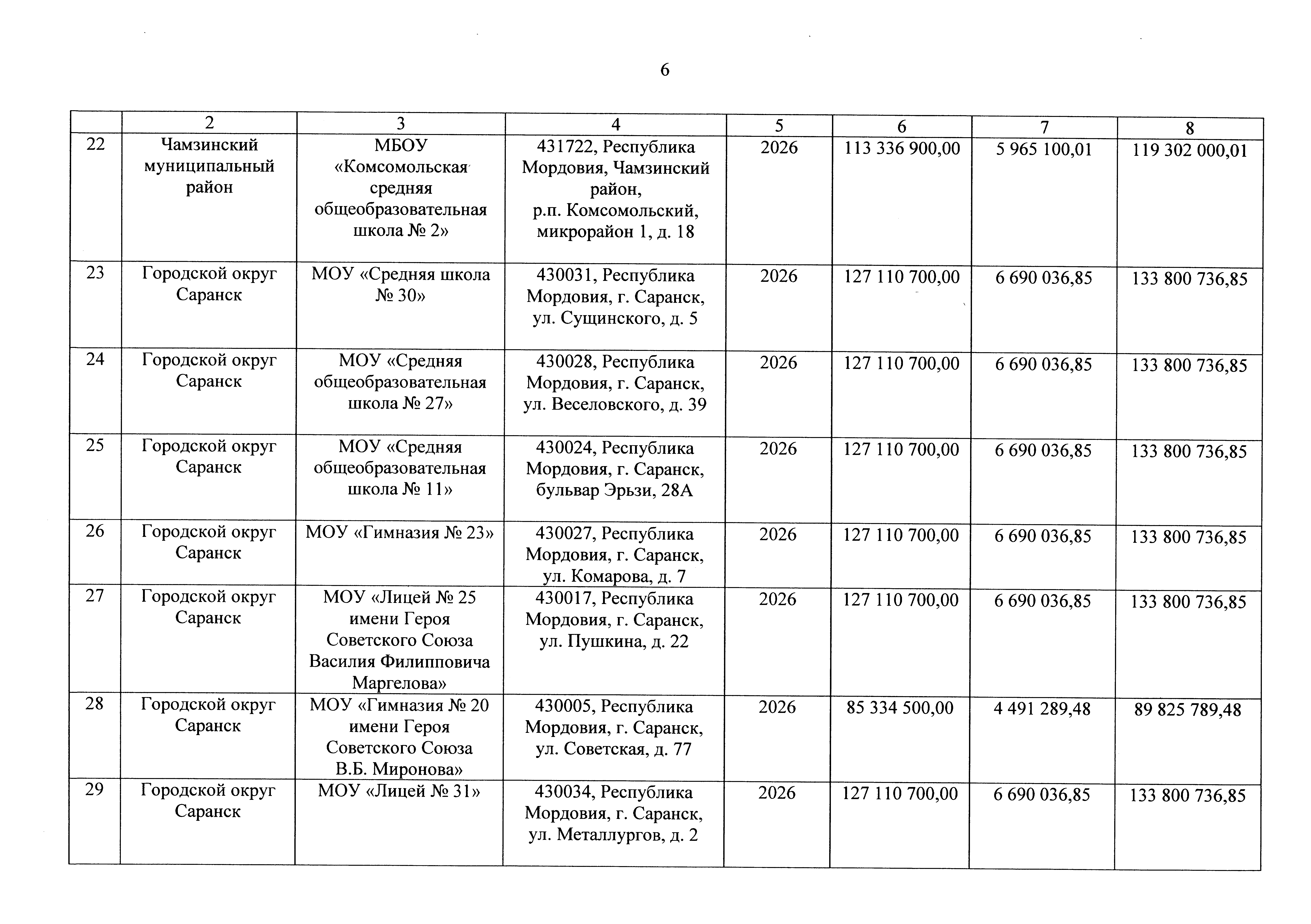 "О внесении изменения в распределение субсидий бюджетам муниципальных районов Республики Мордовия и городского округа Саранск на софинансирование из республиканского бюджета Республики Мордовия расходов, возникающих при реализации мероприятий по модернизации школьных систем образования в рамках государственной программы Республики Мордовия "Развитие образования в Республике Мордовия", в 2026 – 2027 годах"