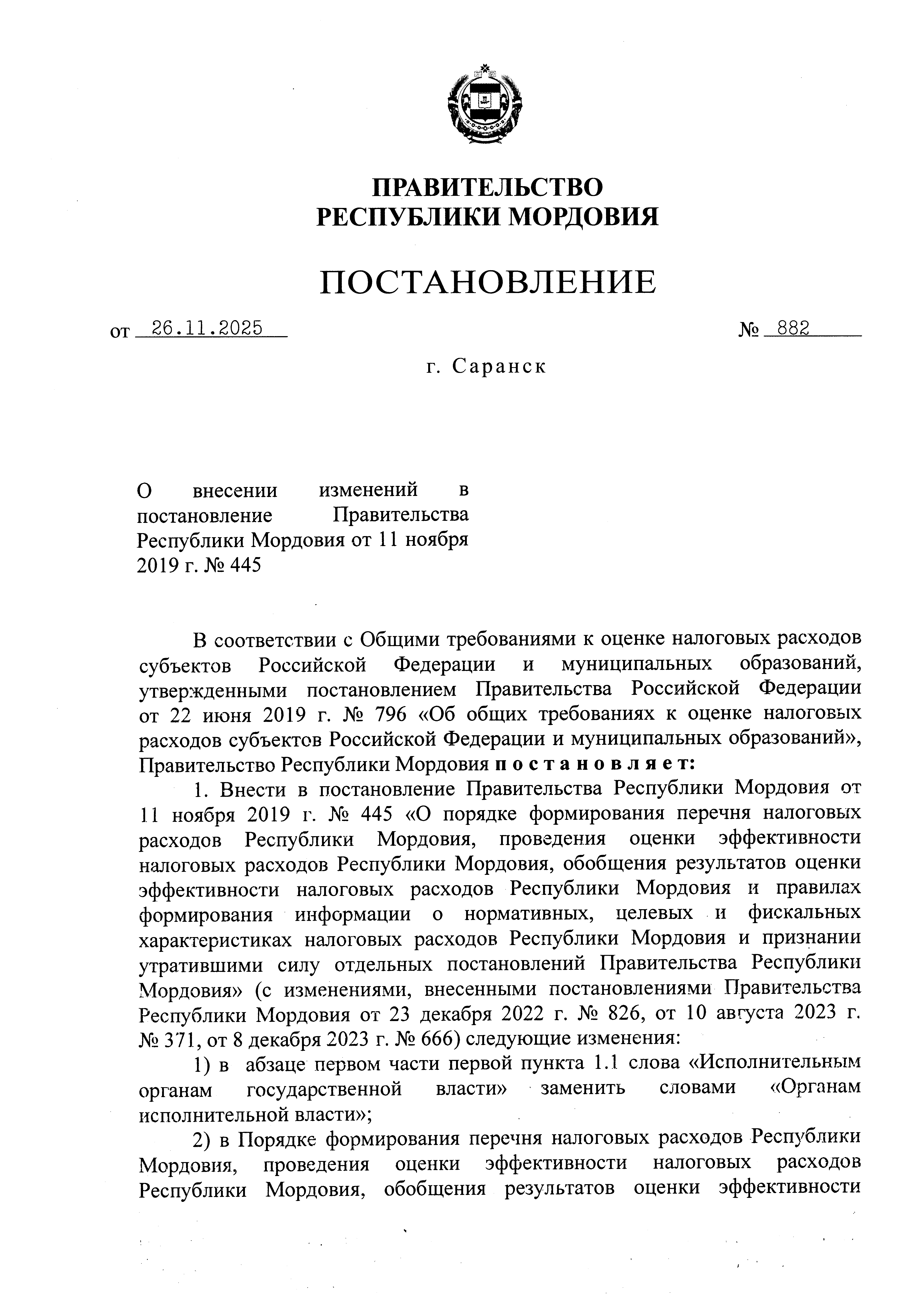 Постановление Правительства Республики Мордовия от 26.11.2025 № 882