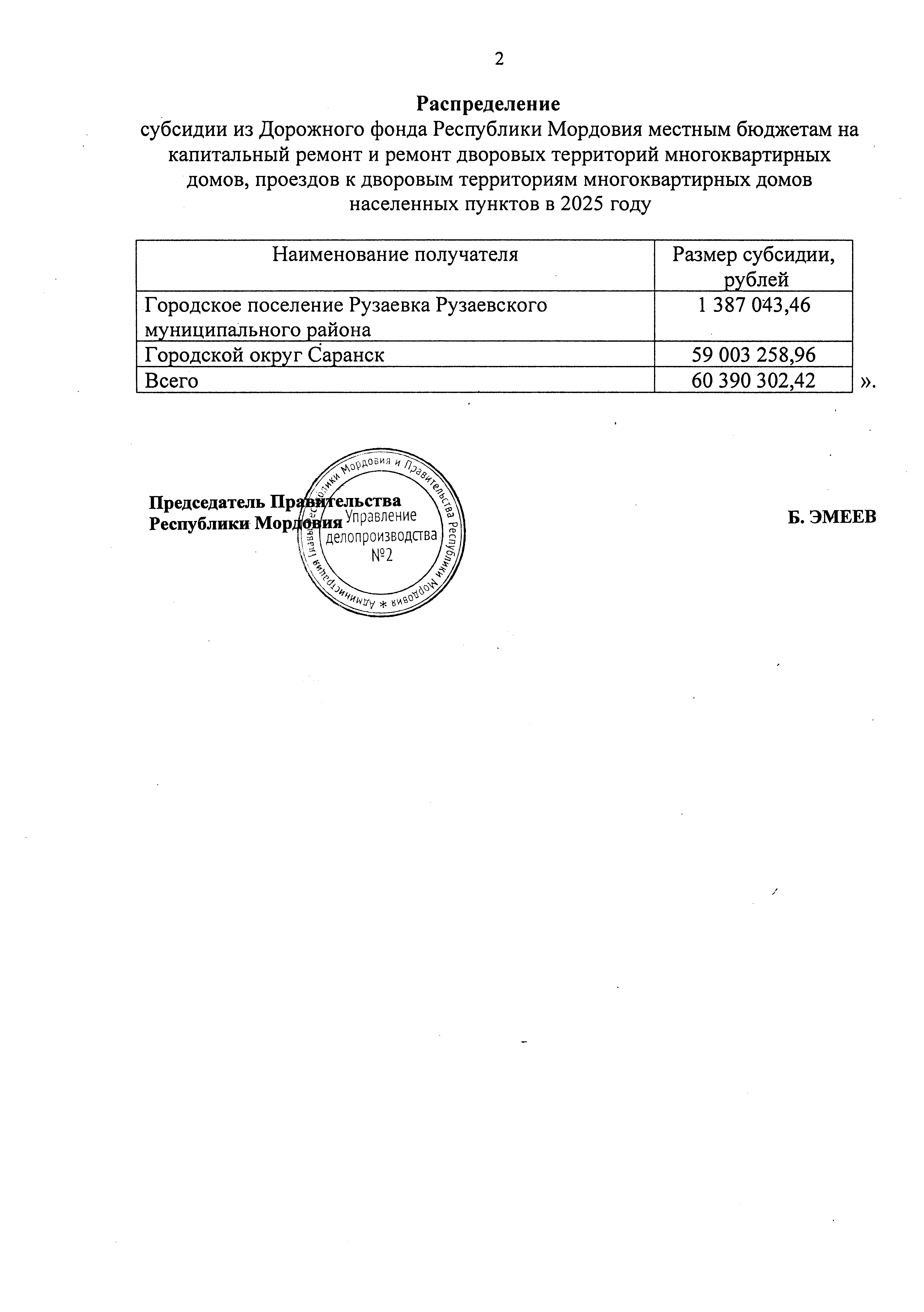 "О внесении изменения в распределение субсидии из Дорожного фонда Республики Мордовия местным бюджетам на капитальный ремонт и ремонт дворовых территорий многоквартирных домов, проездов к дворовым территориям многоквартирных домов населенных пунктов в 2025 году"