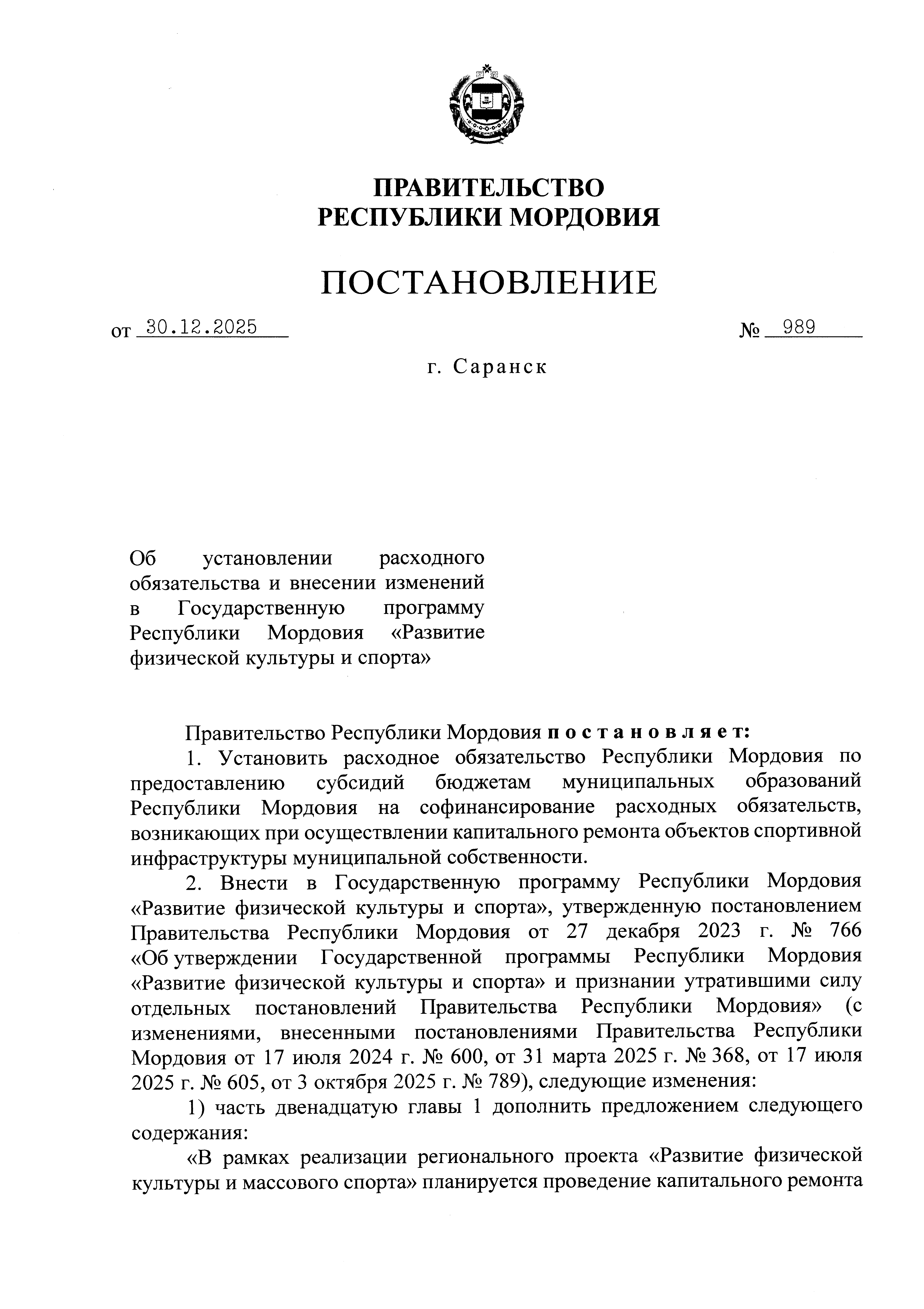 Постановление Правительства Республики Мордовия от 30.12.2025 № 989