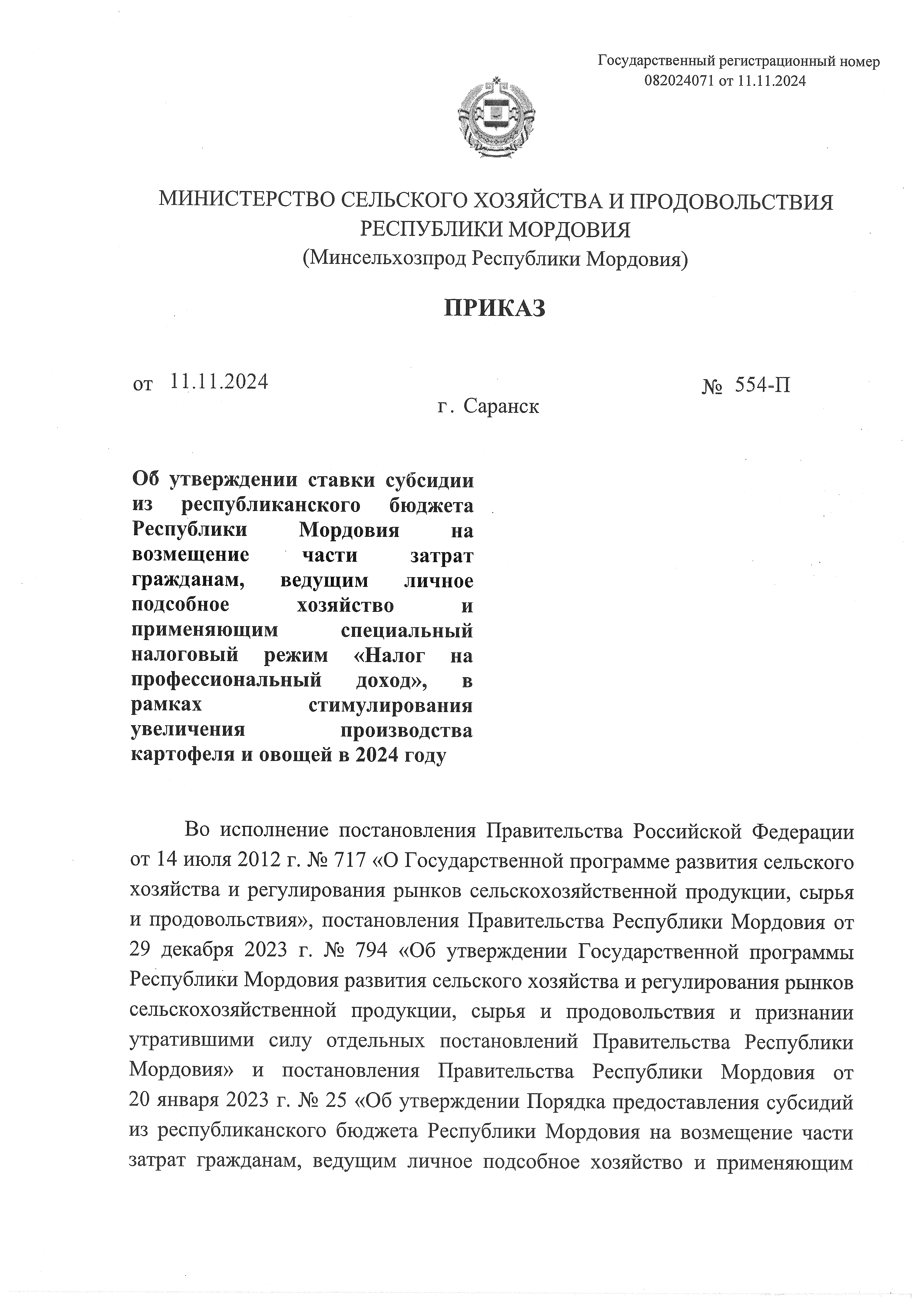 Приказ Министерства сельского хозяйства и продовольствия Республики Мордовия от 11.11.2024 № 554-П