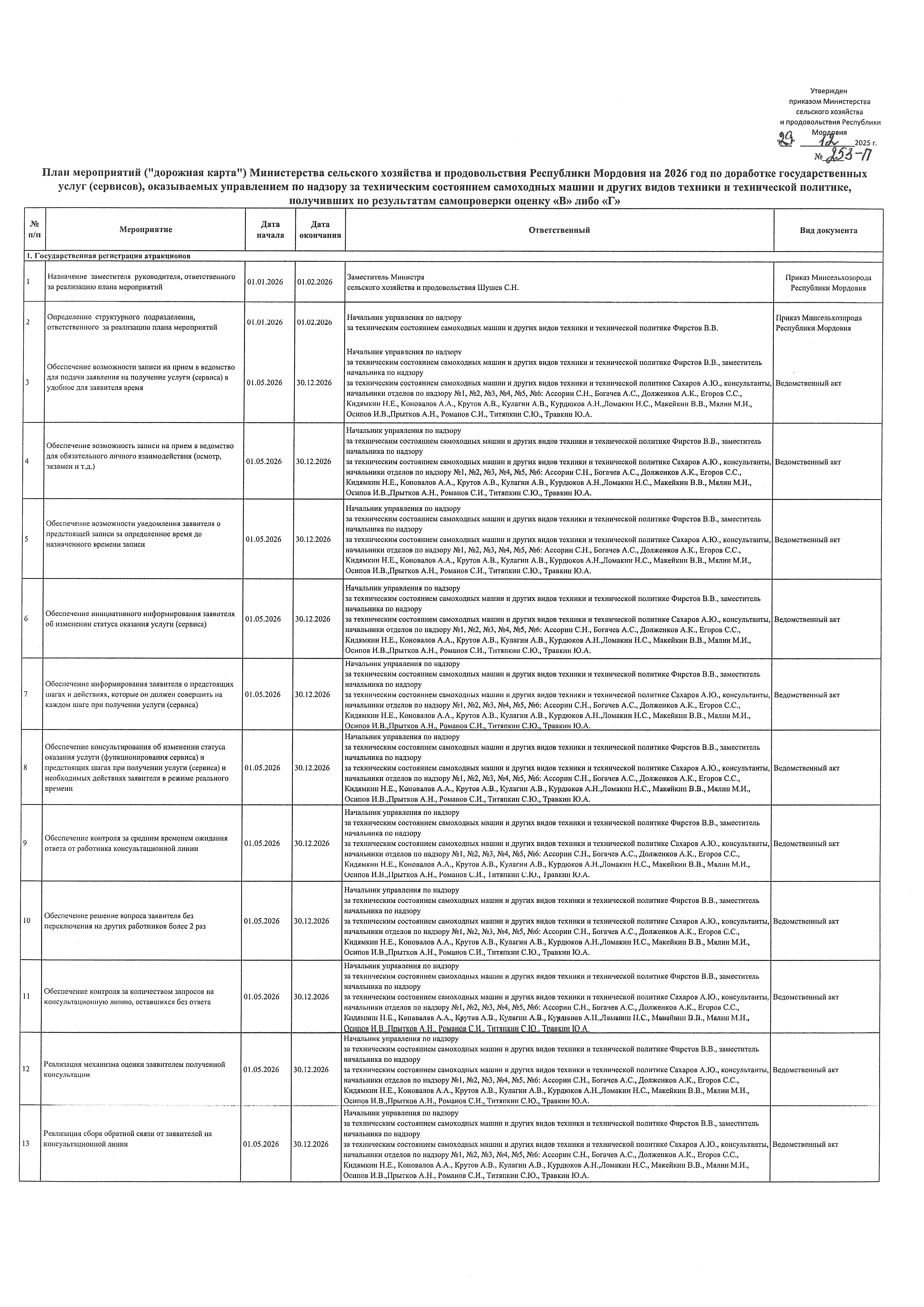 "Об утверждении Плана мероприятий ( "дорожная карта") Министерства сельского хозяйства и продовольствия Республики Мордовия на 2026 год по доработке государственных услуг (сервисов), оказываемых управлением по надзору за техническим состоянием самоходных машин и других видов техники и технической политике, получивших по результатам самопроверки оценку "В" либо "Г"