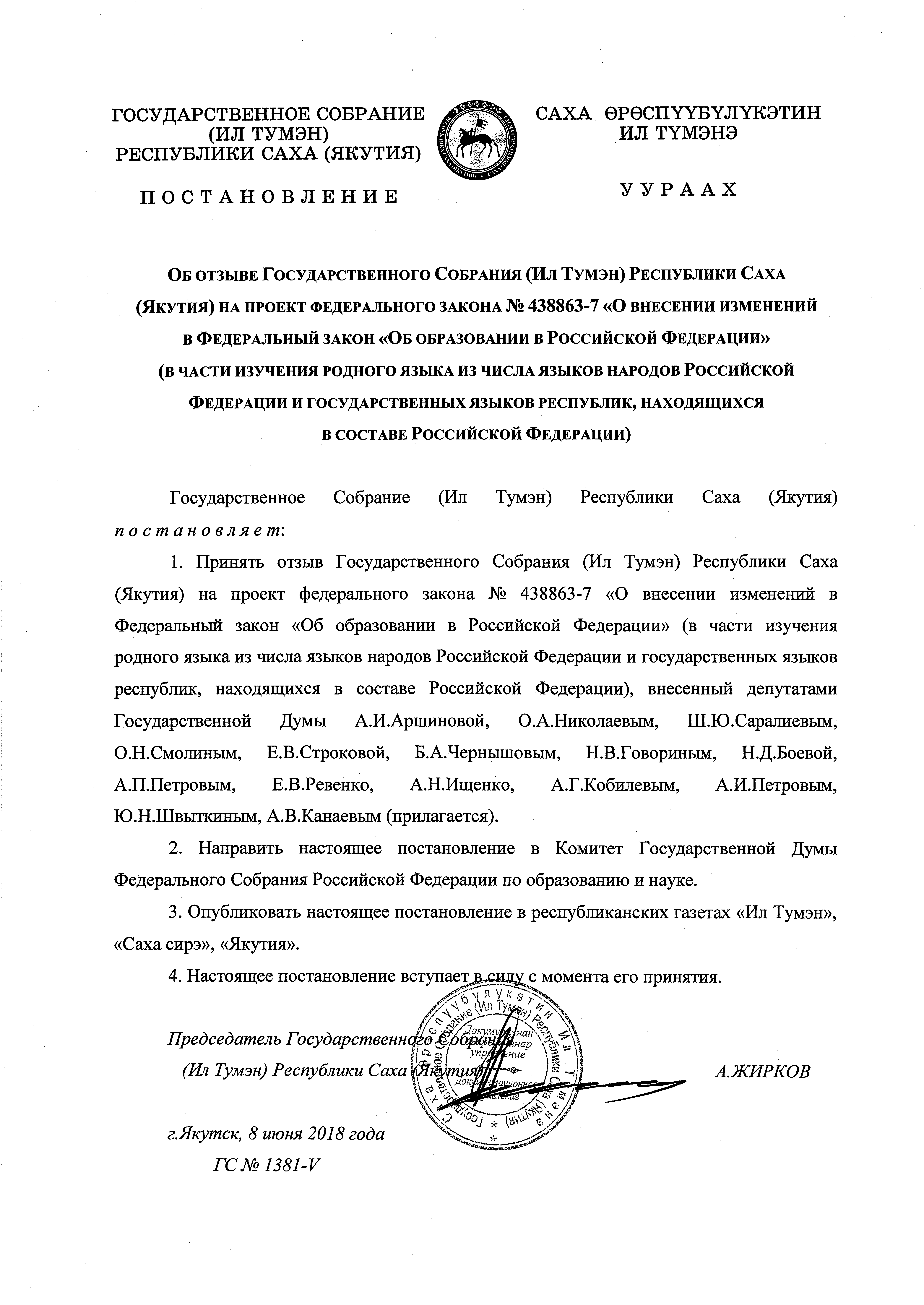 Постановление Государственного Собрания (Ил Тумэн) Республики Саха (Якутия) от 08.06.2018 ГС № 1381-V