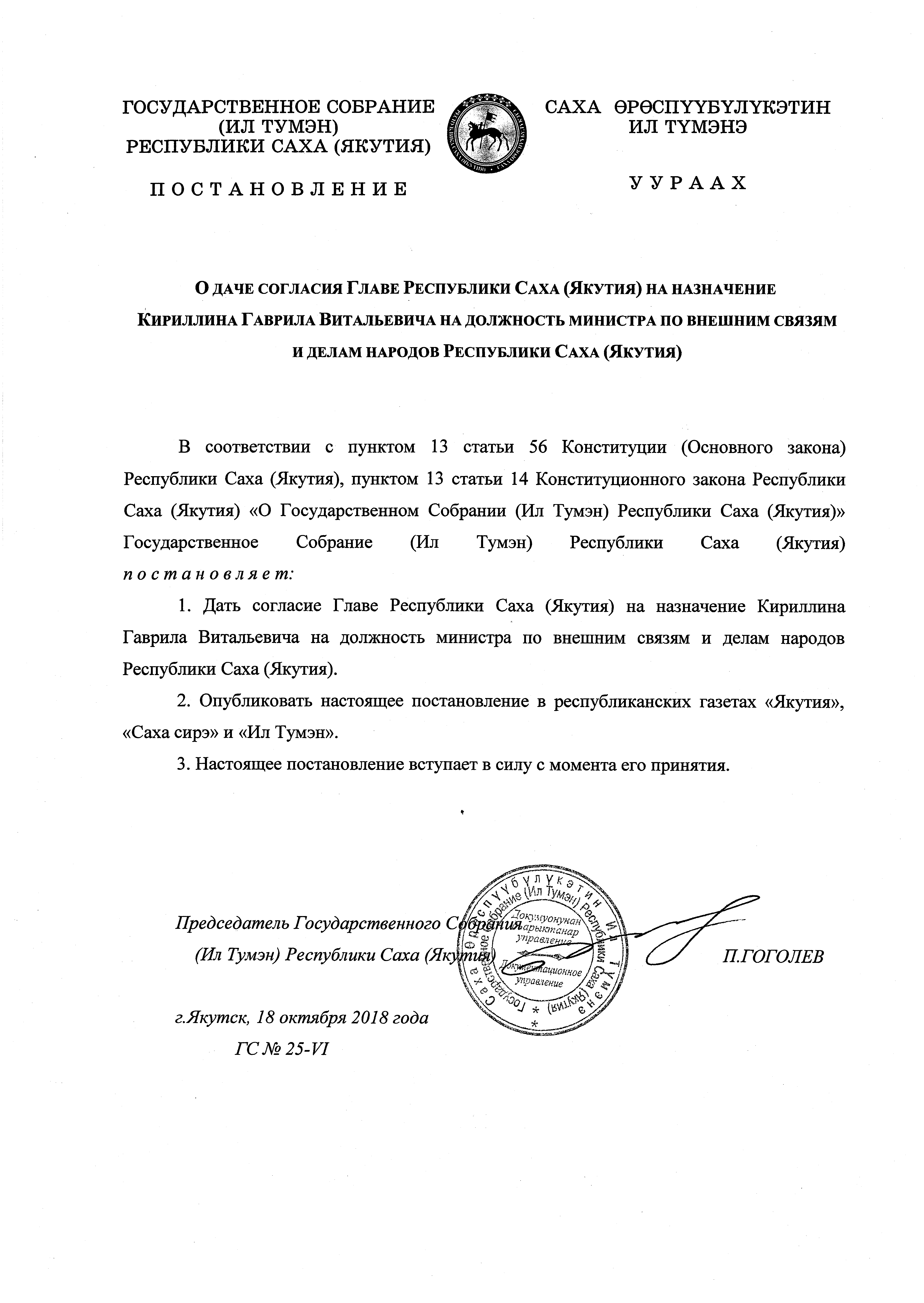Постановление Государственного Собрания (Ил Тумэн) Республики Саха (Якутия) от 18.10.2018 ГС № 25-VI