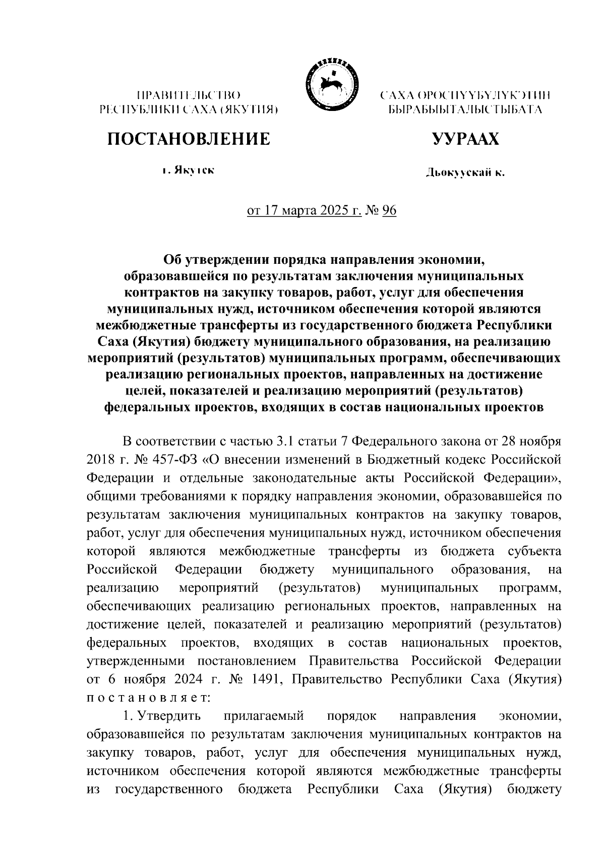 Постановление Правительства Республики Саха (Якутия) от 17.03.2025 № 96