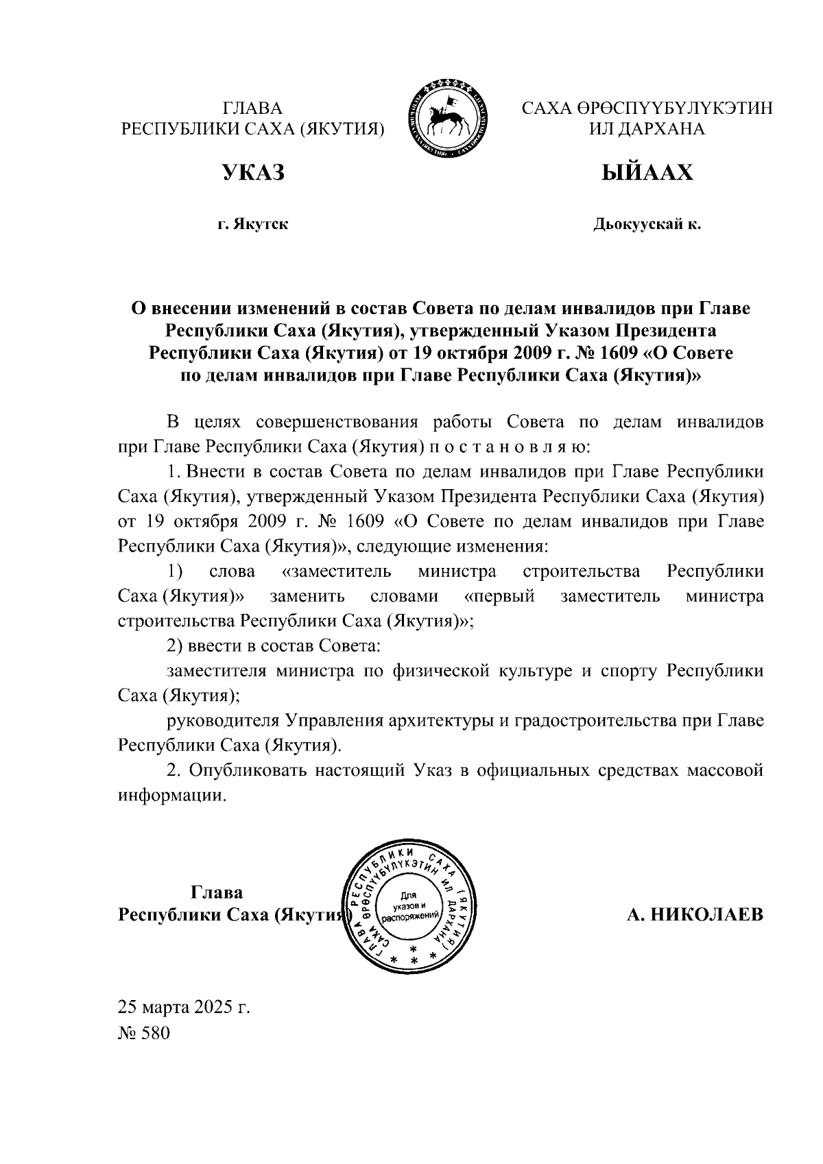 Указ Главы Республики Саха (Якутия) от 25.03.2025 № 580