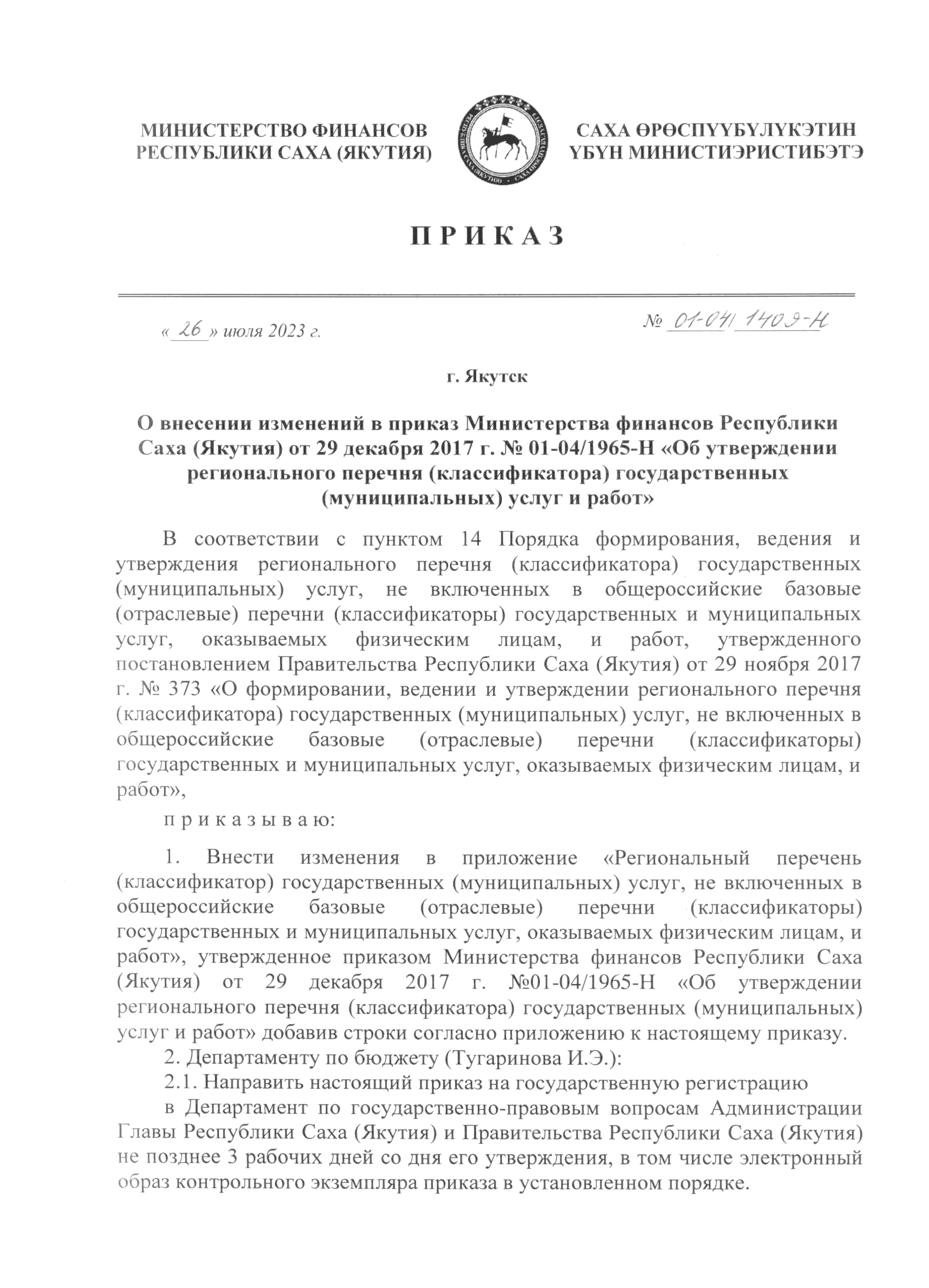 Приказ Министерства финансов Республики Саха (Якутия) от 26.07.2023 № 01-04/1409-Н