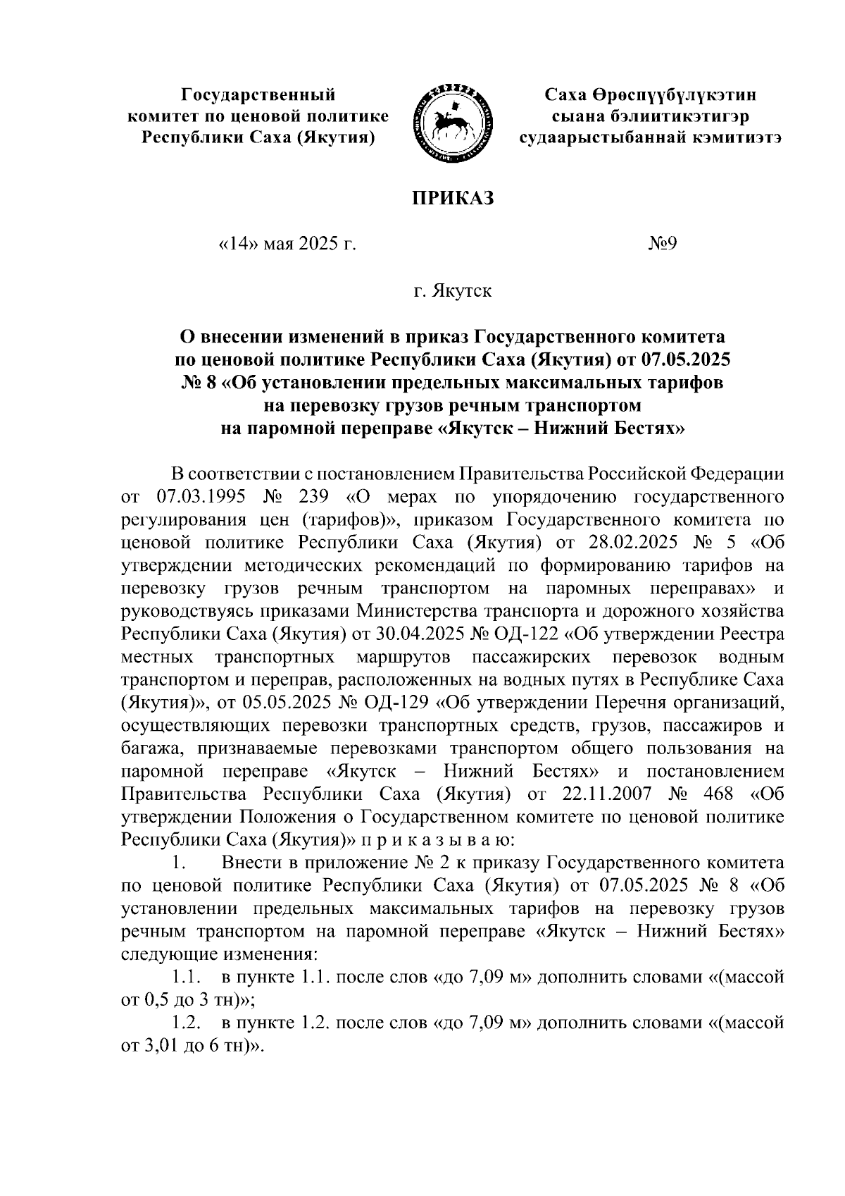 "О внесении изменений в приказ Государственного комитета по ценовой политике Республики Саха (Якутия) от 07.05.2025 № 8 "Об установлении предельных максимальных тарифов на перевозку грузов речным транспортом на паромной переправе "Якутск – Нижний Бестях"
