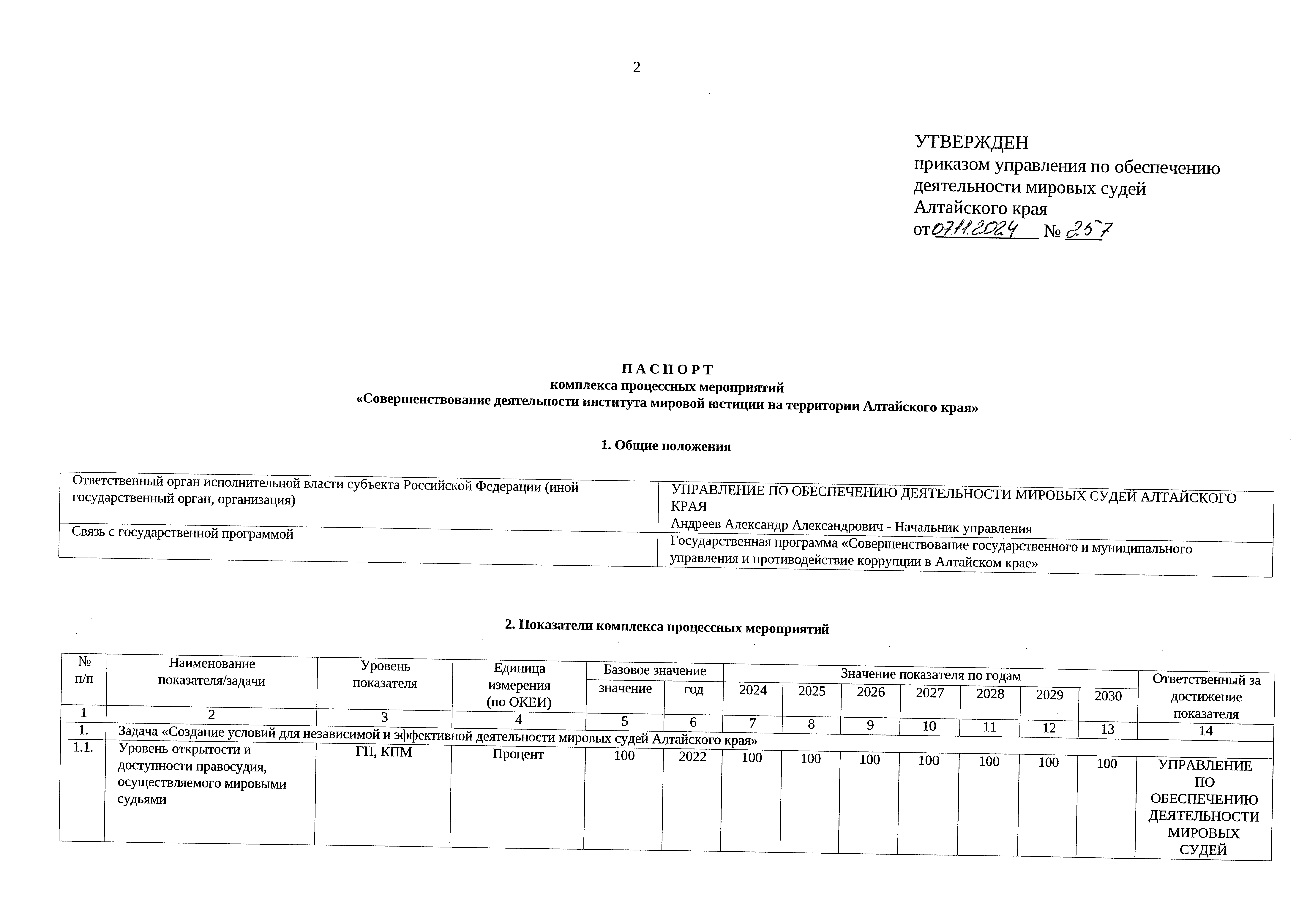 Приказ Управления по обеспечению деятельности мировых судей Алтайского края от 07.11.2024 № 257