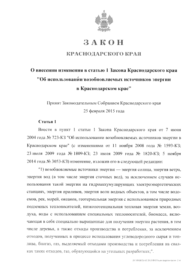 "О внесении изменения в статью 1 Закона Краснодарского края "Об использовании возобновляемых источников энергии в Краснодарском крае"