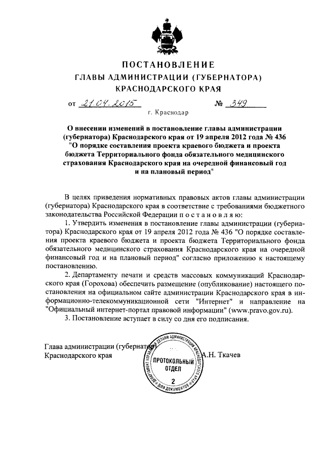 Постановление главы администрации (губернатора) Краснодарского края от 21.04.2015 № 349