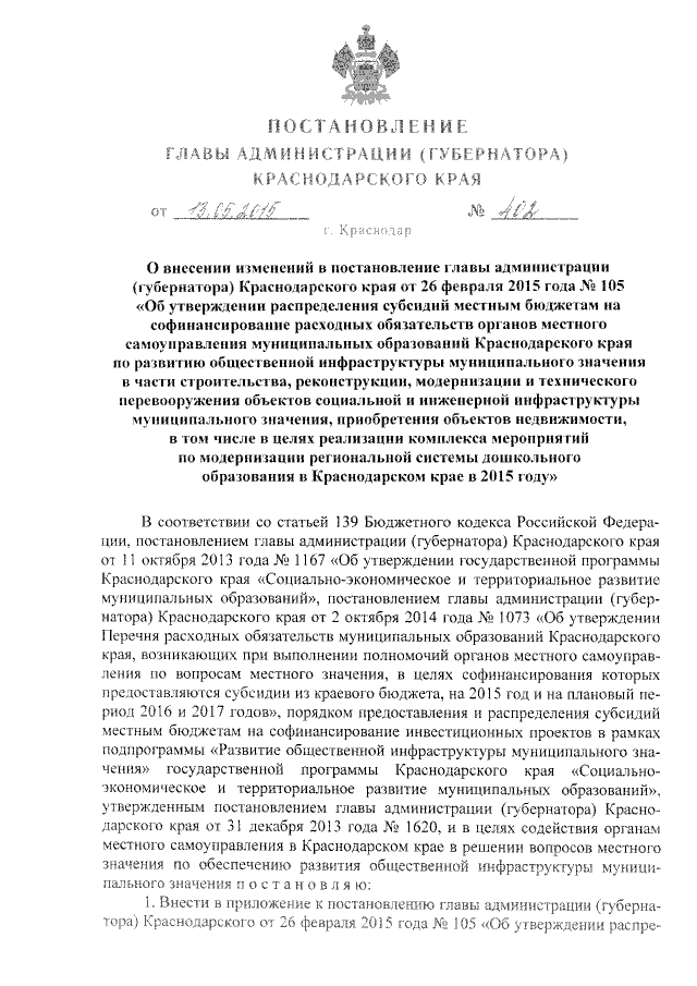 "О внесении изменений в постановление главы администрации (губернатора) Краснодарского края от 26 февраля 2015 года № 105 "Об утверждении распределения субсидий местным бюджетам на софинансирование расходных обязательств органов местного самоуправления муниципальных образований Краснодарского края по развитию общественной инфраструктуры муниципального значения в части строительства, реконструкции, модернизации и технического перевооружения объектов социальной и инженерной инфраструктуры муниципального значения, приобретения объектов недвижимости, в том числе в целях реализации комплекса мероприятий по модернизации региональной системы дошкольного образования в Краснодарском крае в 2015 году"