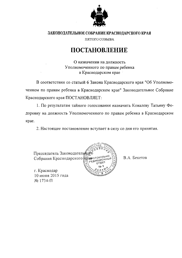 Постановление Законодательного Собрания Краснодарского края от 10.06.2015 № 1734-П