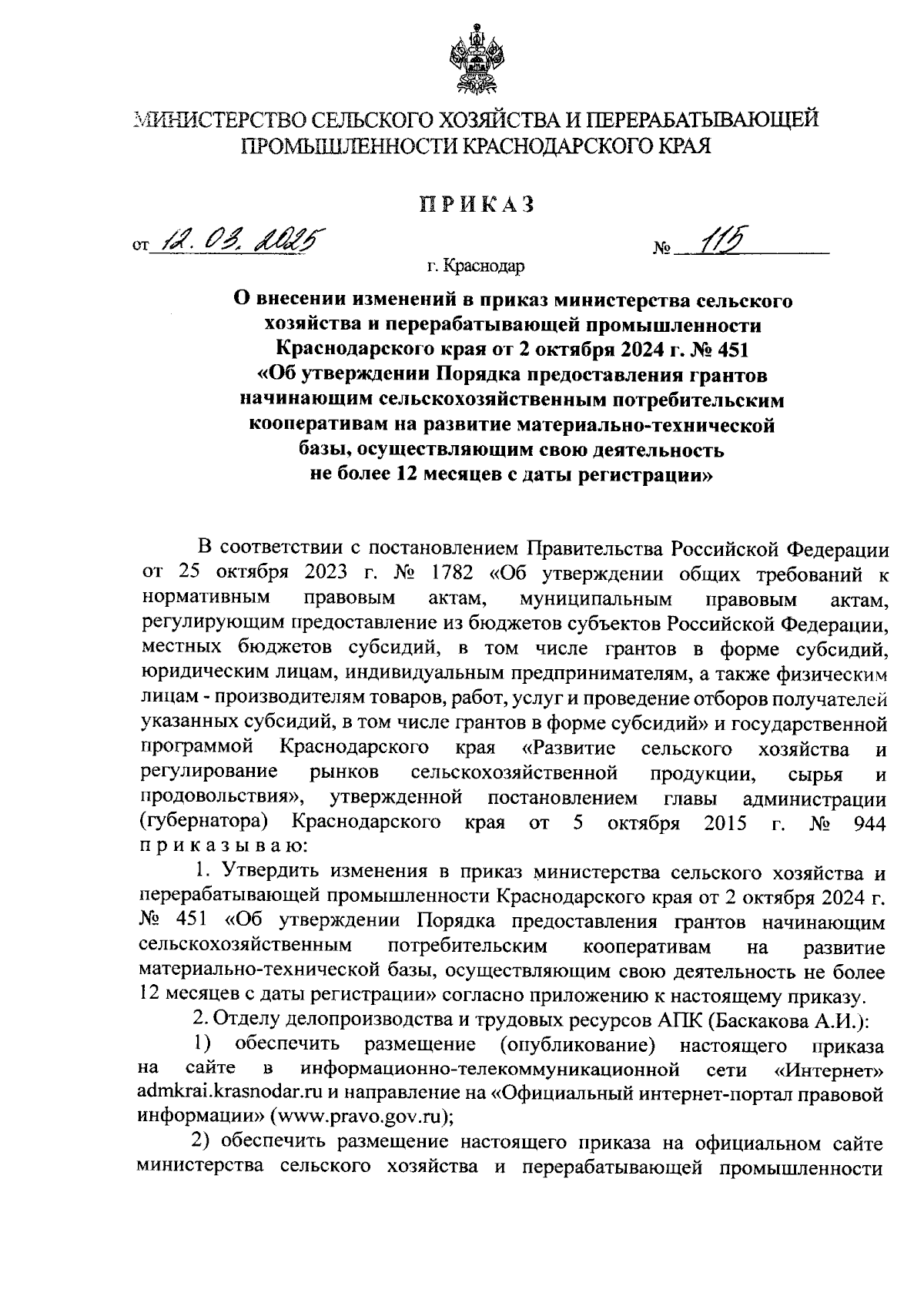 Приказ министерства сельского хозяйства и перерабатывающей промышленности Краснодарского края от 12.03.2025 № 115