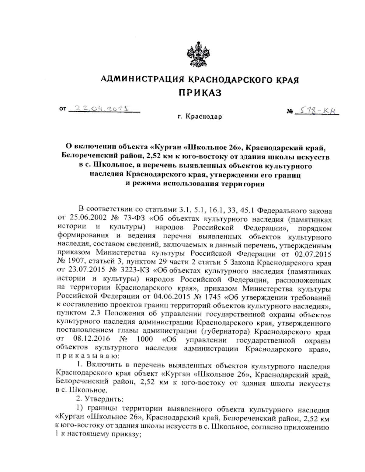 Приказ администрации Краснодарского края от 22.04.2025 № 518-КН