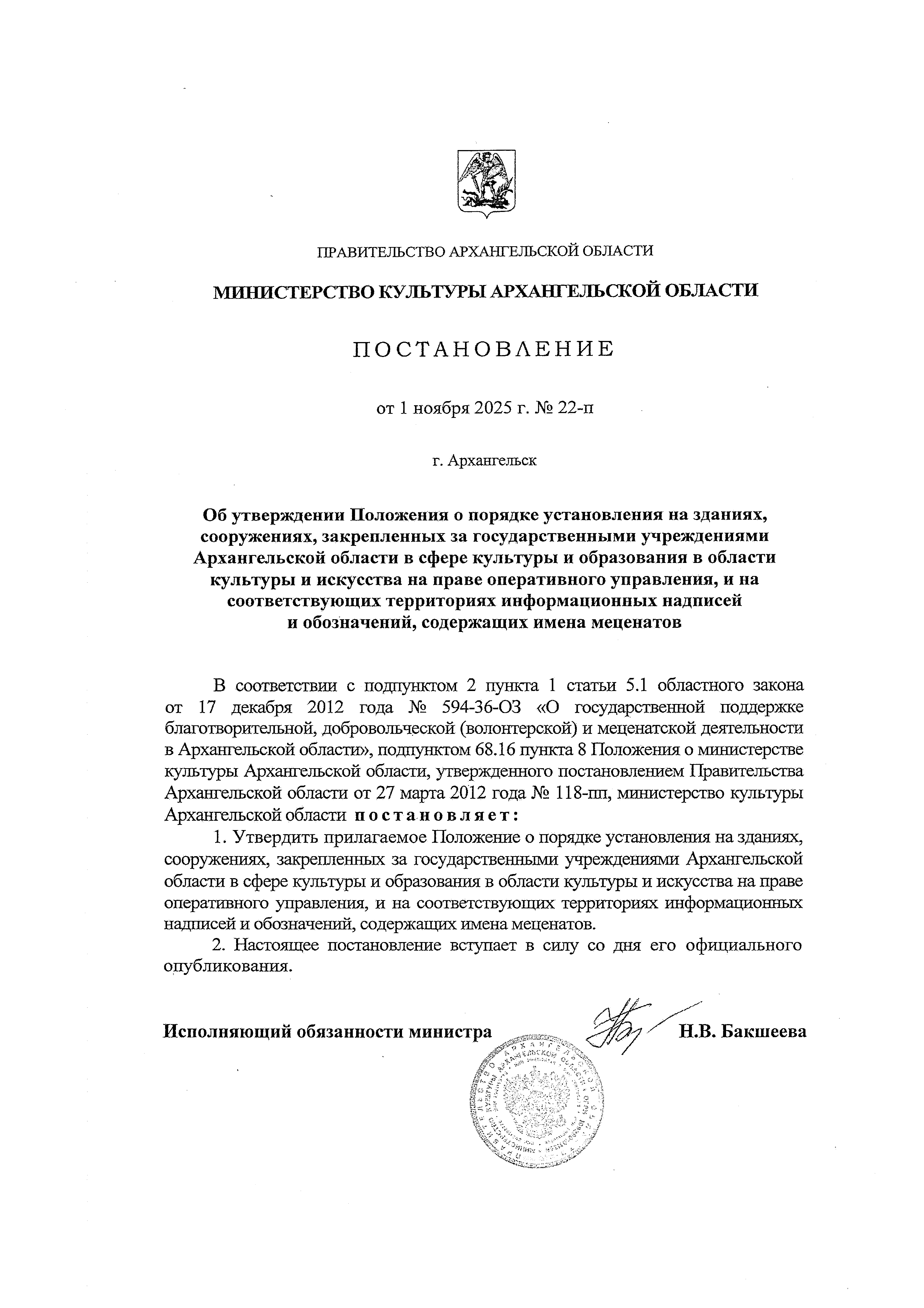 Постановление Министерства культуры Архангельской области от 01.11.2025 № 22-п