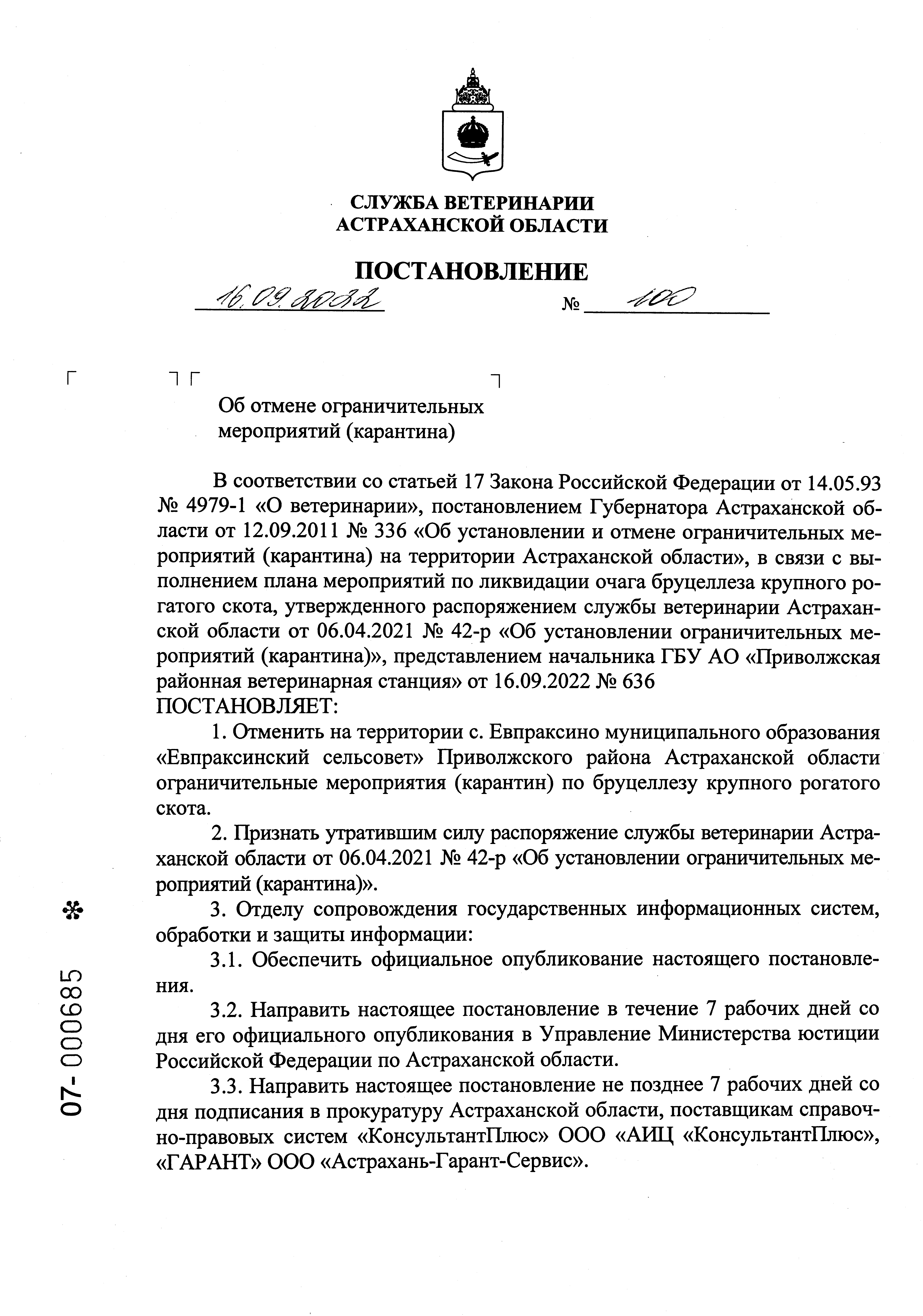 Постановление Службы ветеринарии Астраханской области от 16.09.2022 № 100