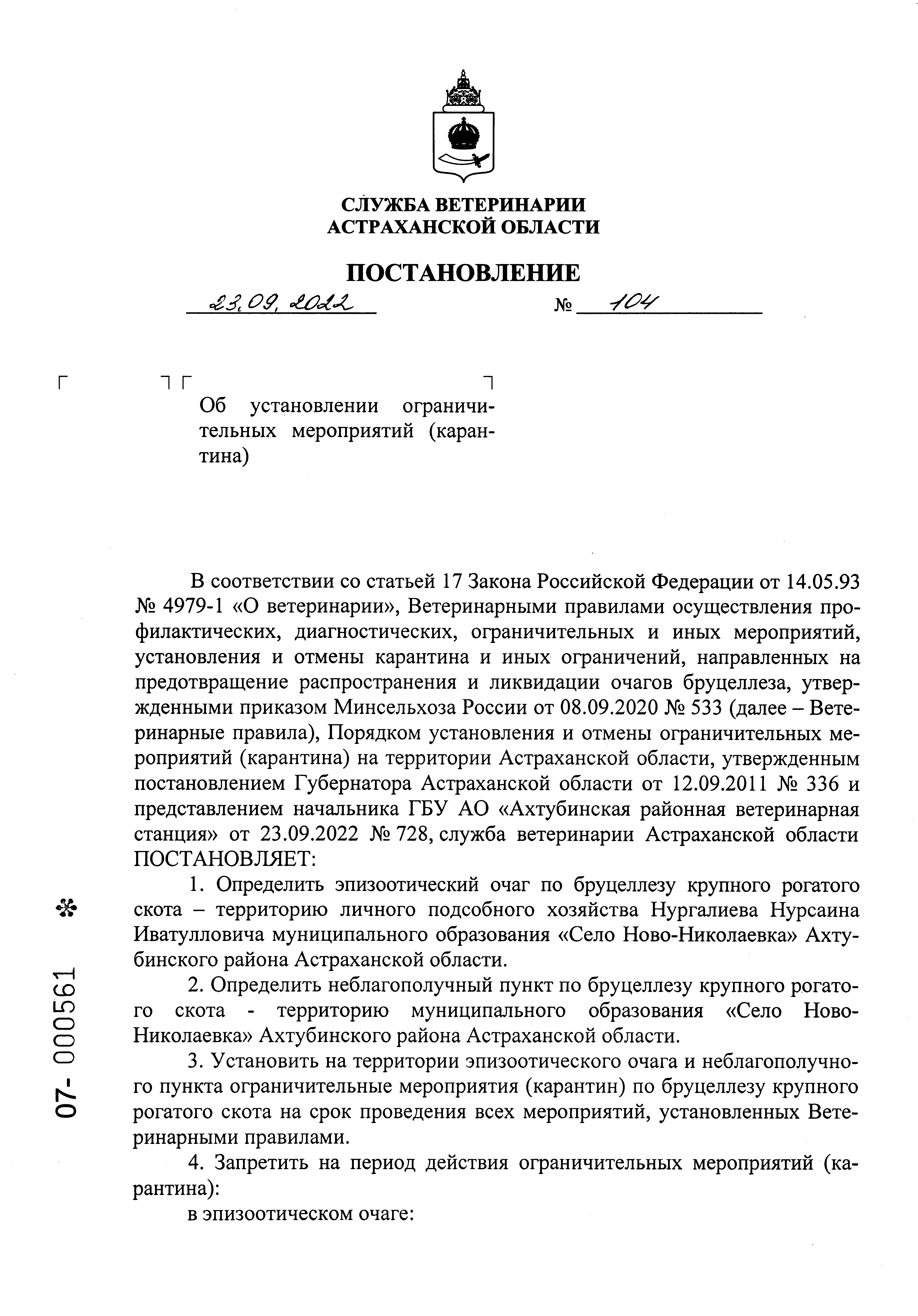 Постановление Службы ветеринарии Астраханской области от 23.09.2022 № 104