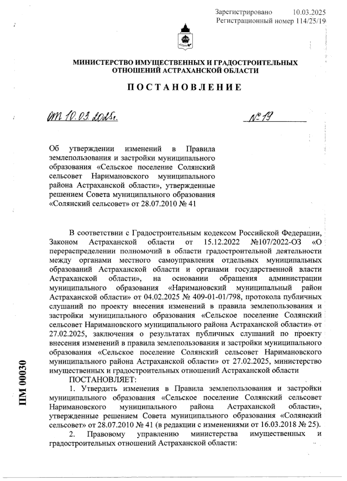Постановление Министерства имущественных и градостроительных отношений Астраханской области от 10.03.2025 № 19