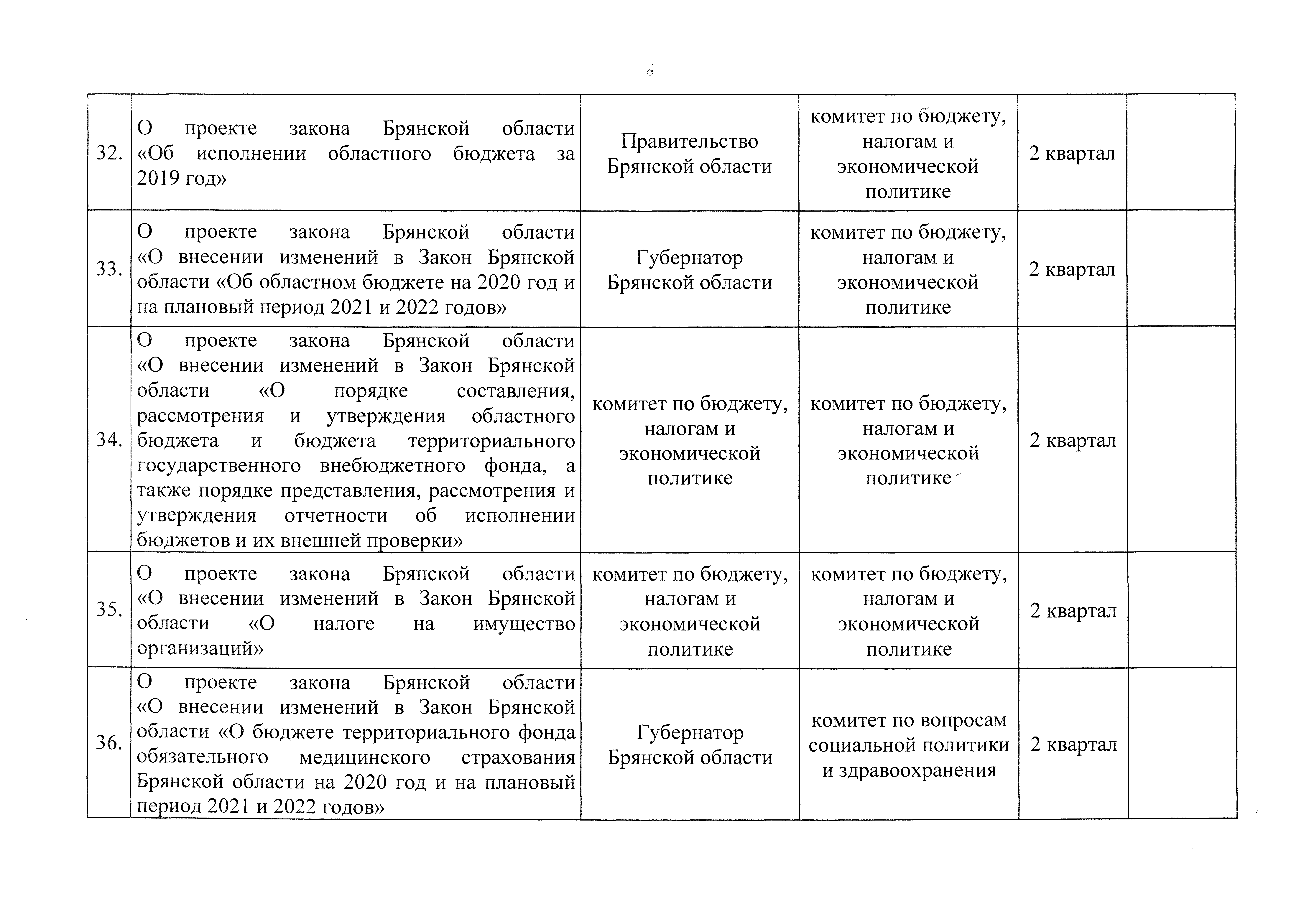 "О плане законотворческой деятельности Брянской областной Думы на первое полугодие 2020 года"