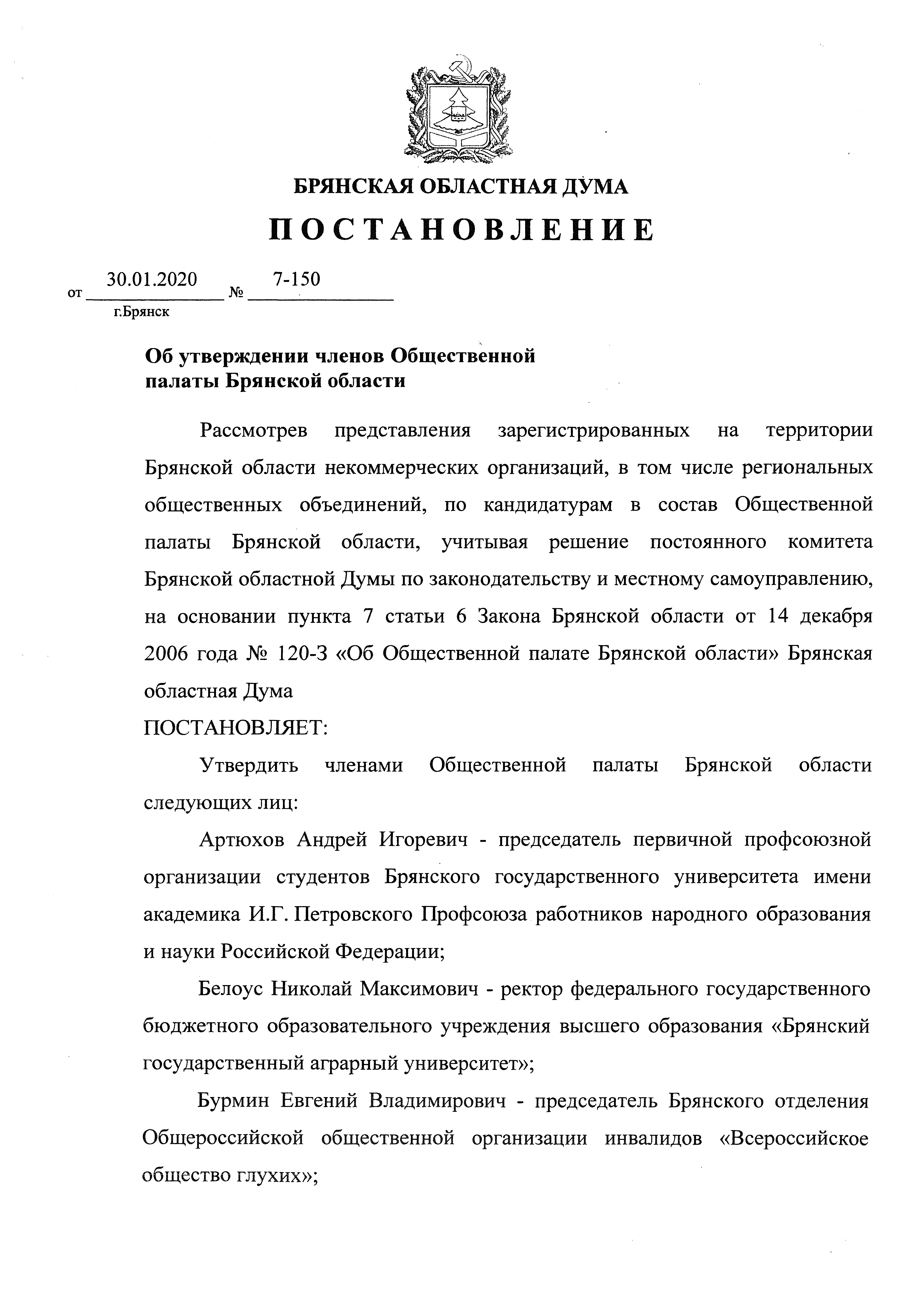 Постановление Брянской областной Думы от 30.01.2020 № 7-150