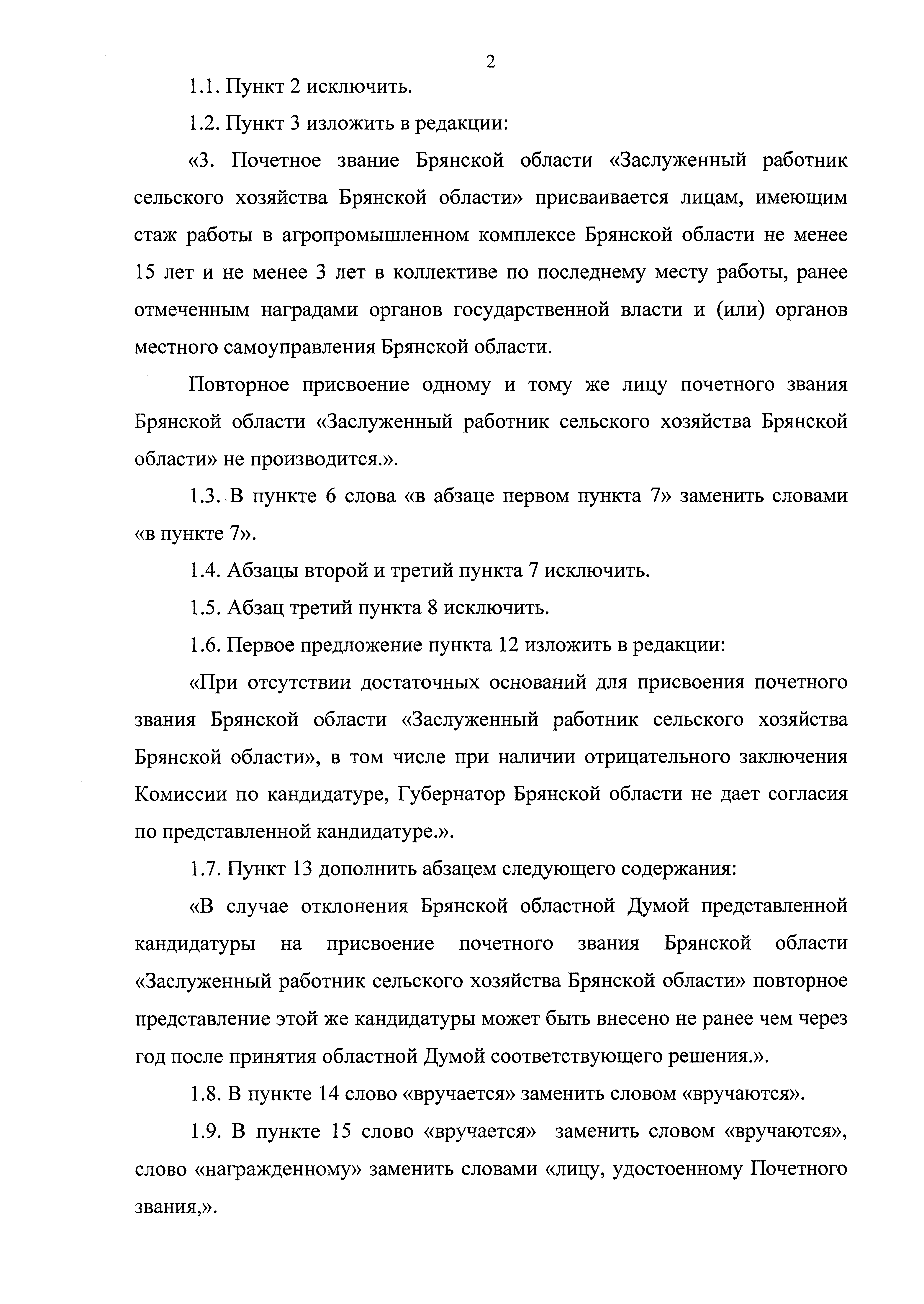 "О внесении изменений в постановление Брянской областной Думы от 20.02.2018 № 6-1122 "Об учреждении почетного звания Брянской области "Заслуженный работник сельского хозяйства Брянской области"