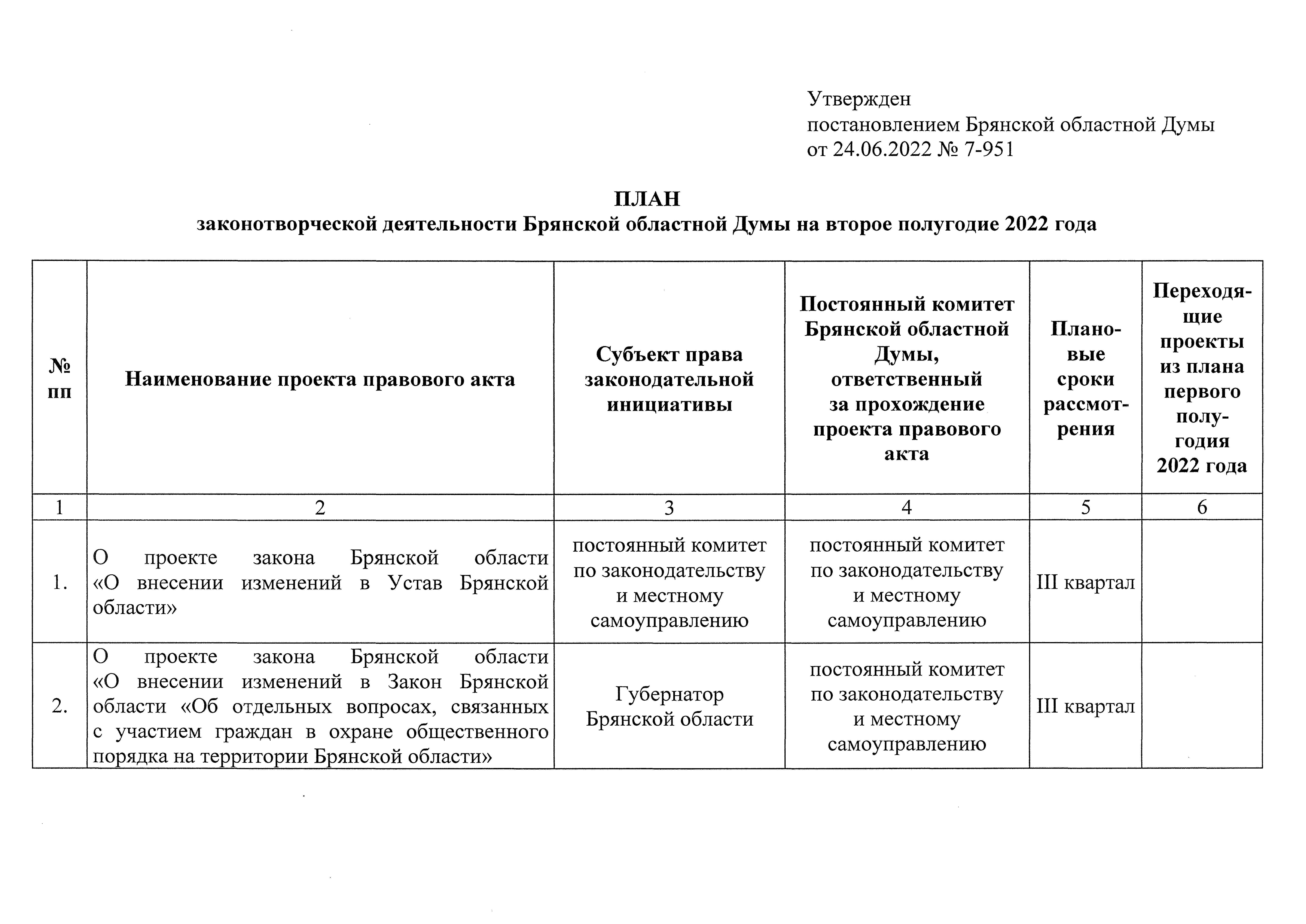 "О плане законотворческой деятельности Брянской областной Думы на второе полугодие 2022 года"