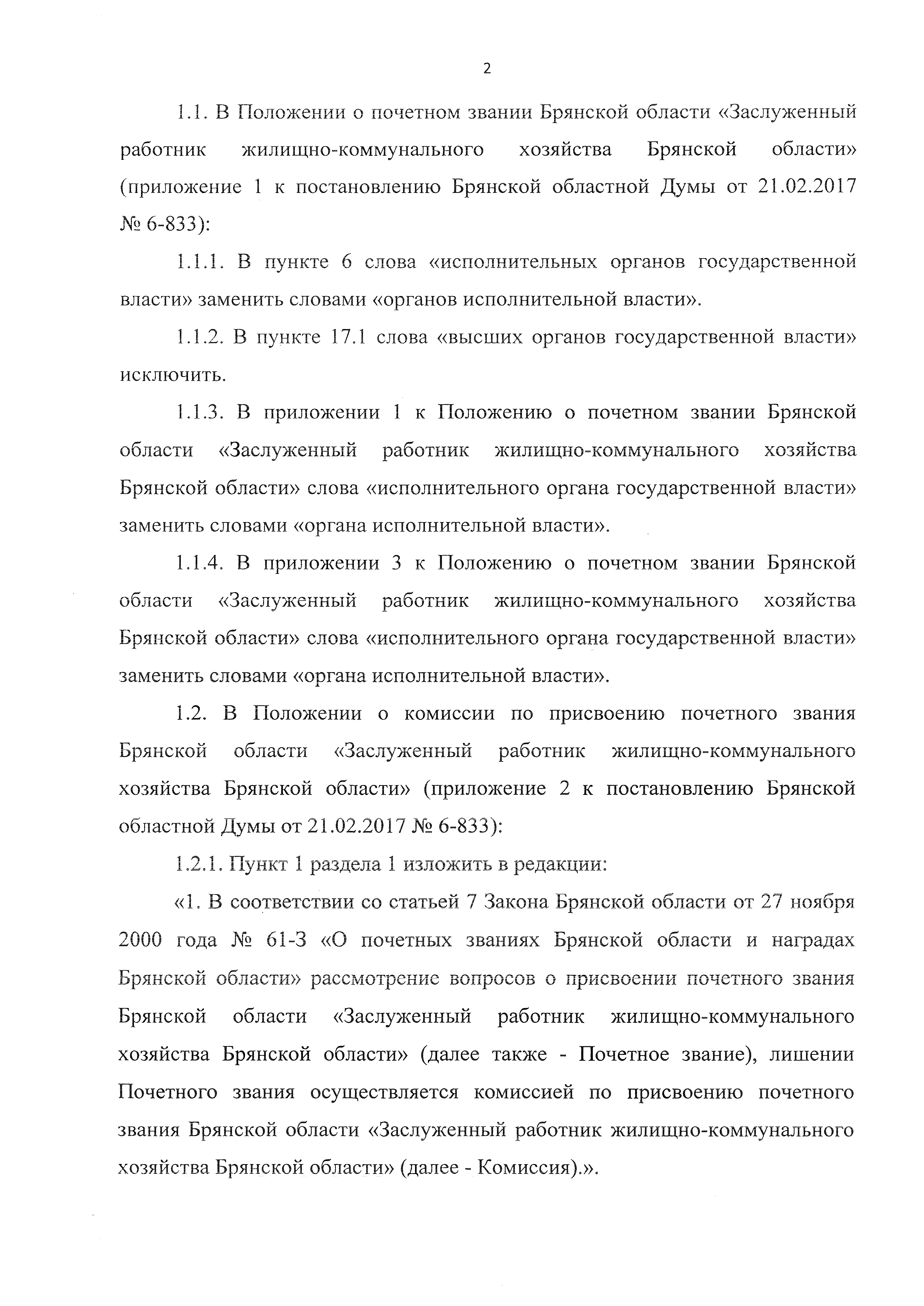 "О внесении изменений в постановление Брянской областной Думы от 21.02.2017 № 6-833 "Об учреждении почетного звания Брянской области "Заслуженный работник жилищно-коммунального хозяйства Брянской области"