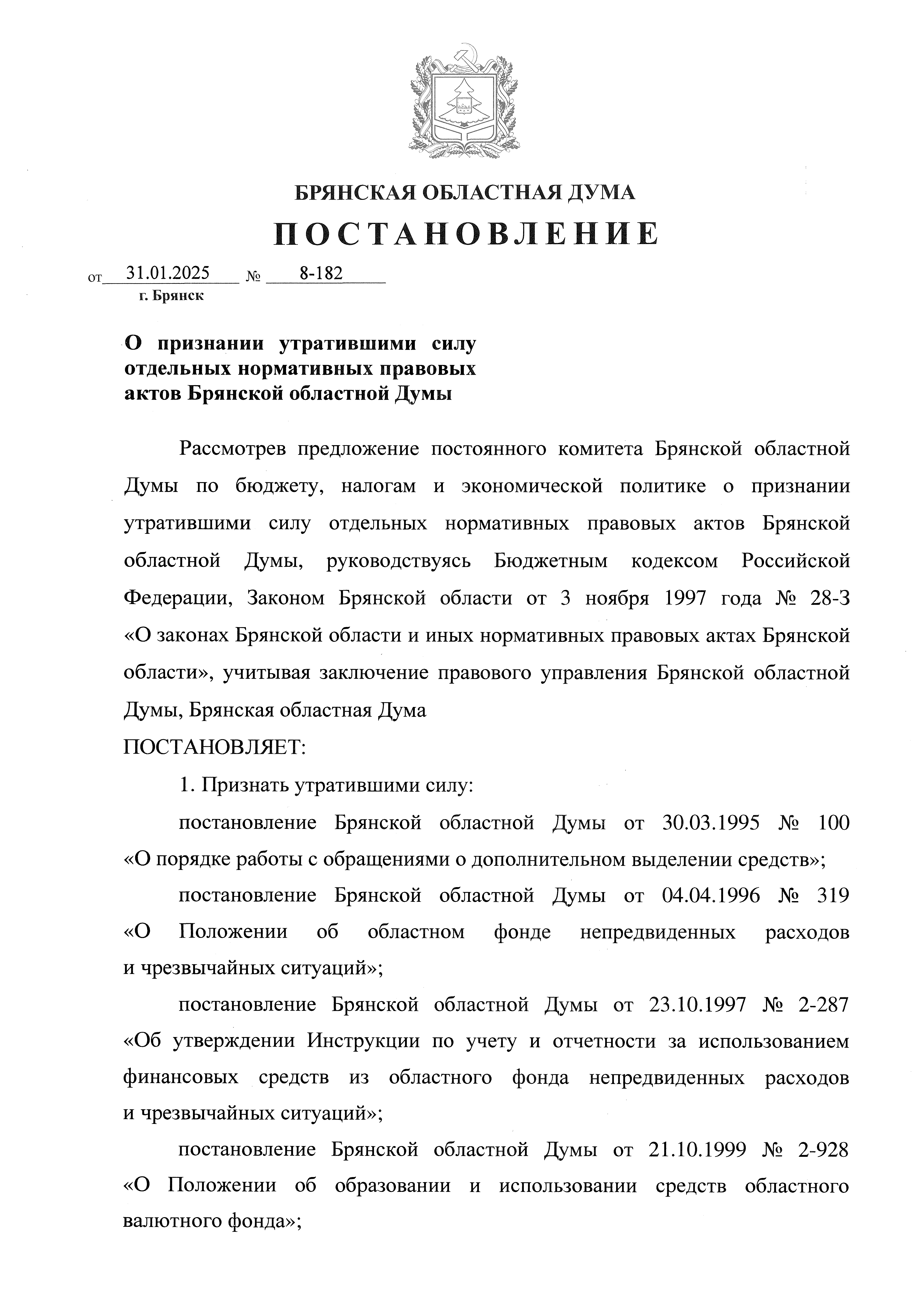 Постановление Брянской областной Думы от 31.01.2025 № 8-182