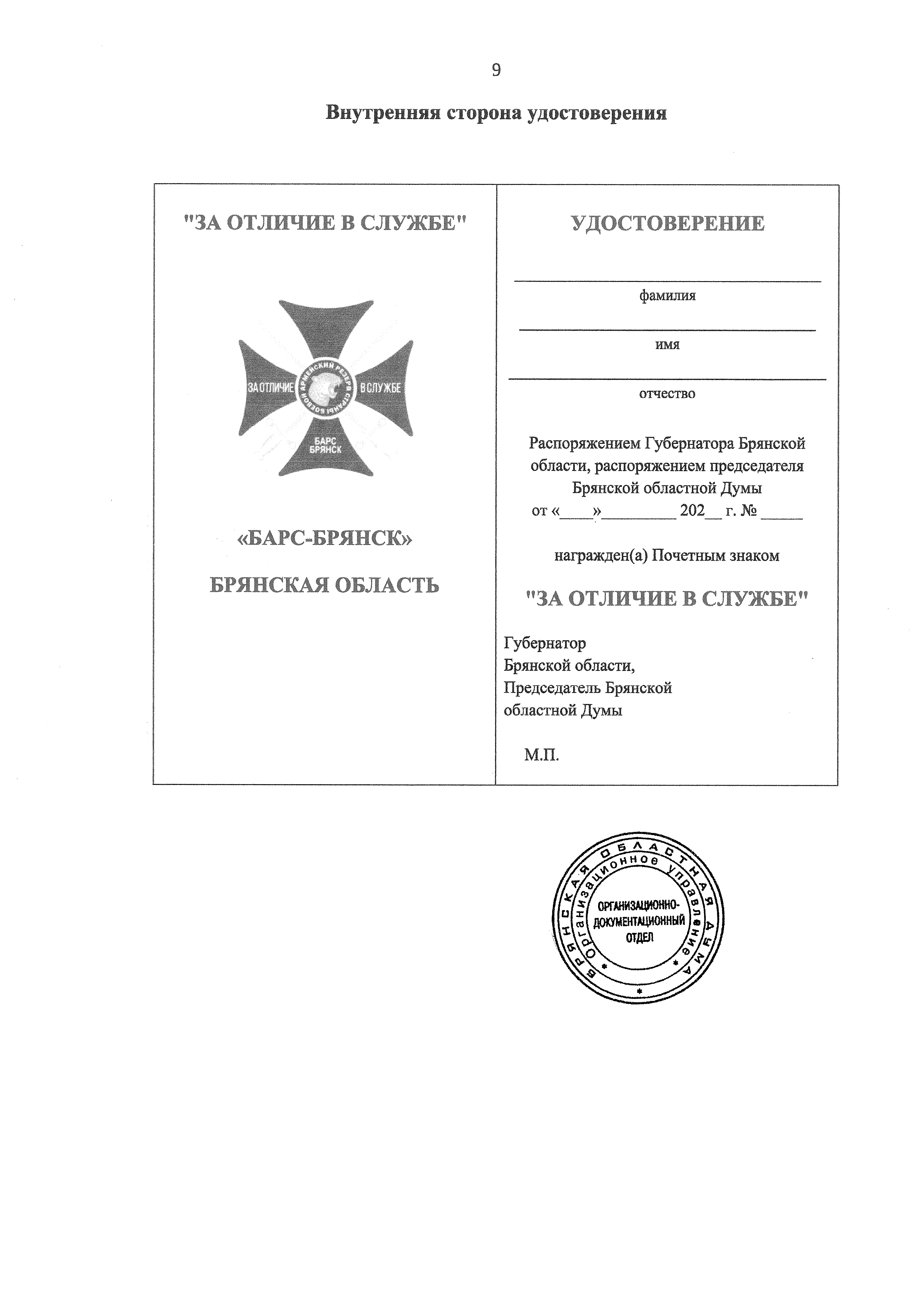 "Об учреждении Почетного знака Брянской области "За отличие в службе"