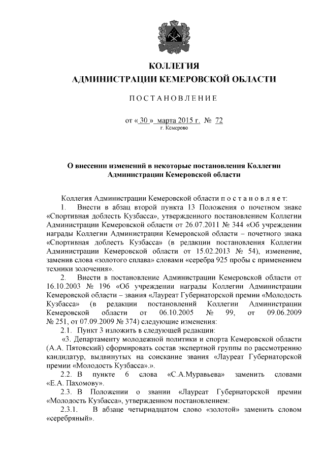 Постановление Коллегии Администрации Кемеровской области от 30.03.2015 № 72