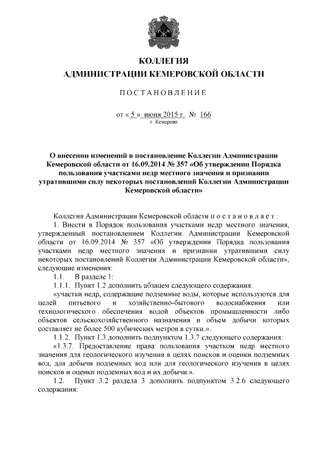 "О внесении изменений в постановление Коллегии Администрации Кемеровской области от 16.09.2014 № 357 "Об утверждении Порядка пользования участками недр местного значения и признании утратившими силу некоторых постановлений Коллегии Администрации Кемеровской области"