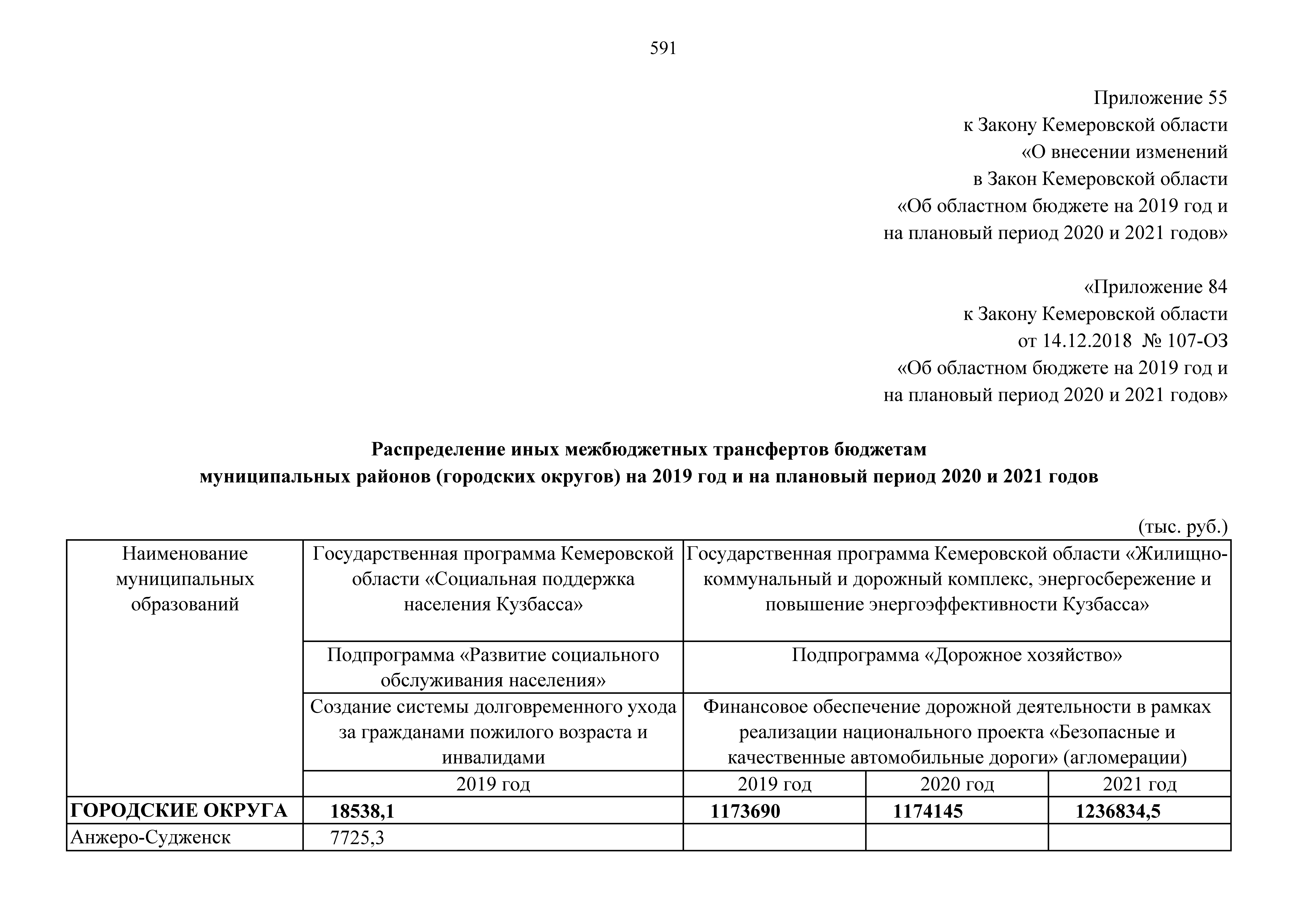 "О внесении изменений в Закон Кемеровской области "Об областном бюджете на 2019 год и на плановый период 2020 и 2021 годов"
