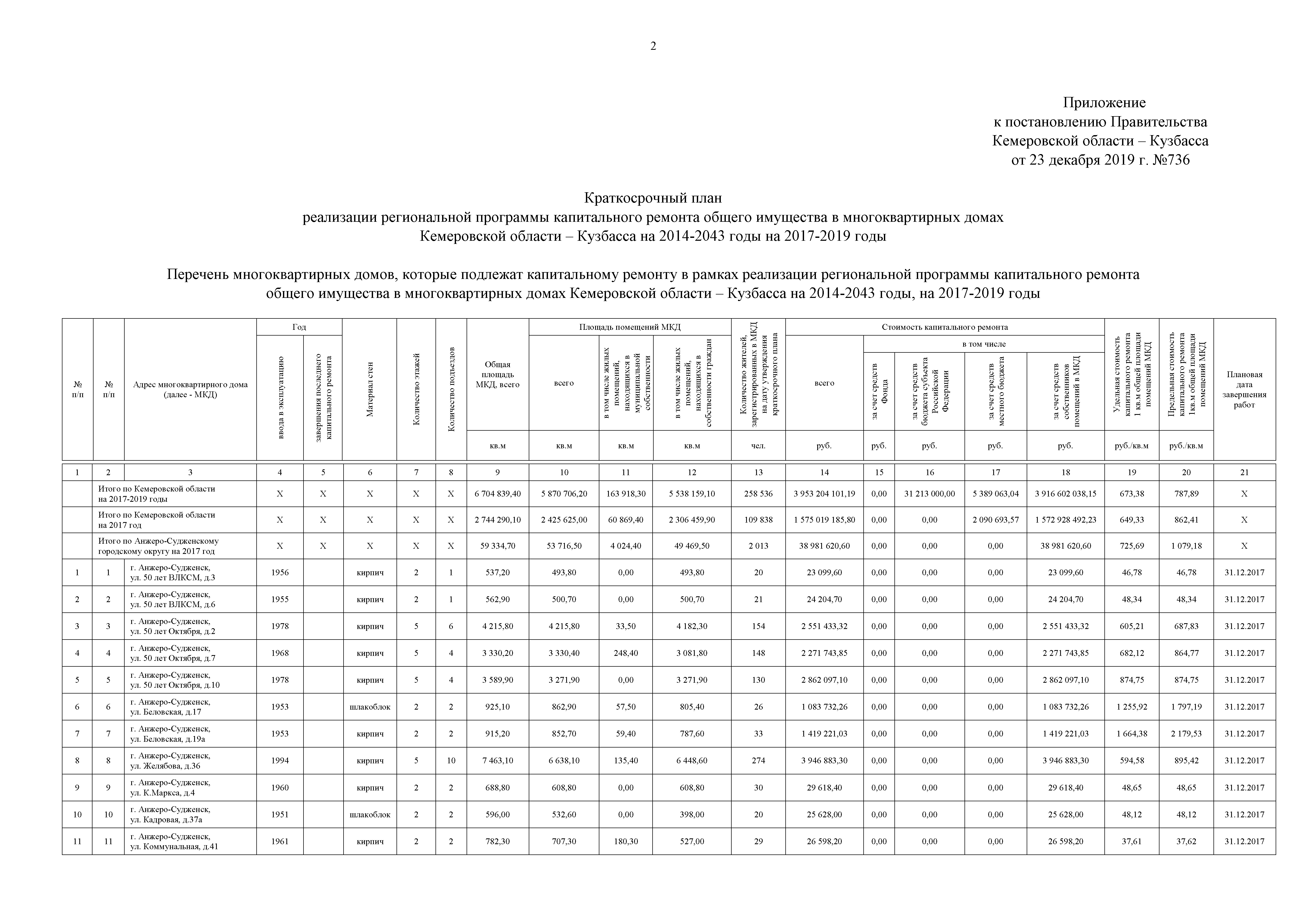 Постановление Правительства Кемеровской области - Кузбасса от 23.12.2019 № 736
