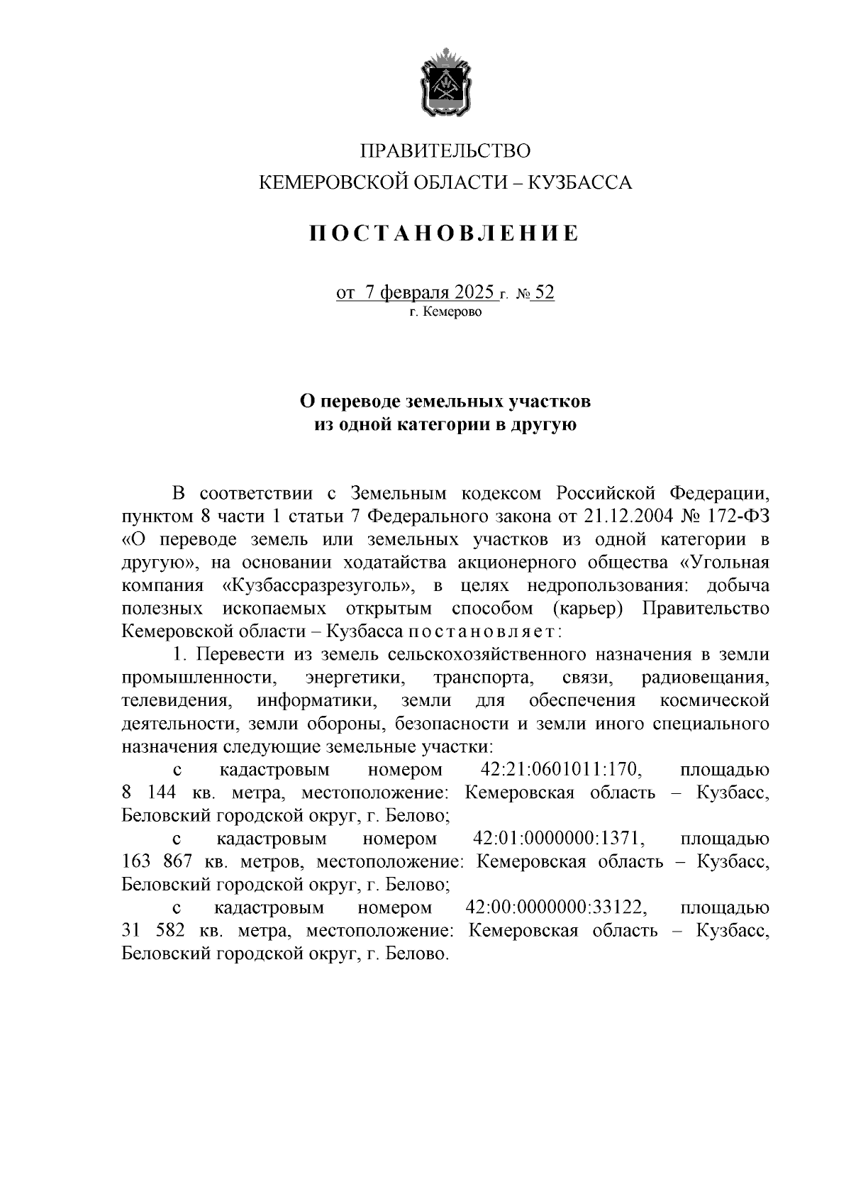 Постановление Правительства Кемеровской области - Кузбасса от 07.02.2025 № 52
