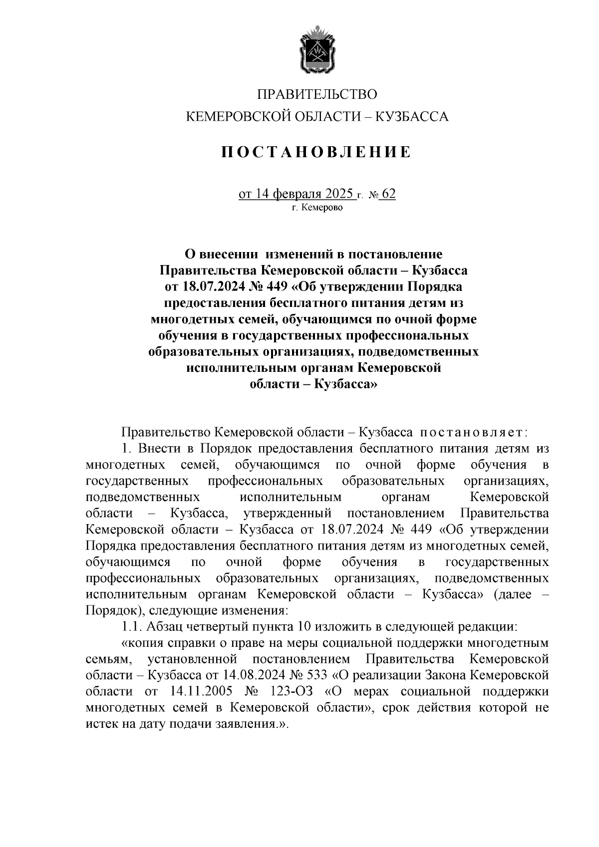 Постановление Правительства Кемеровской области - Кузбасса от 14.02.2025 № 62