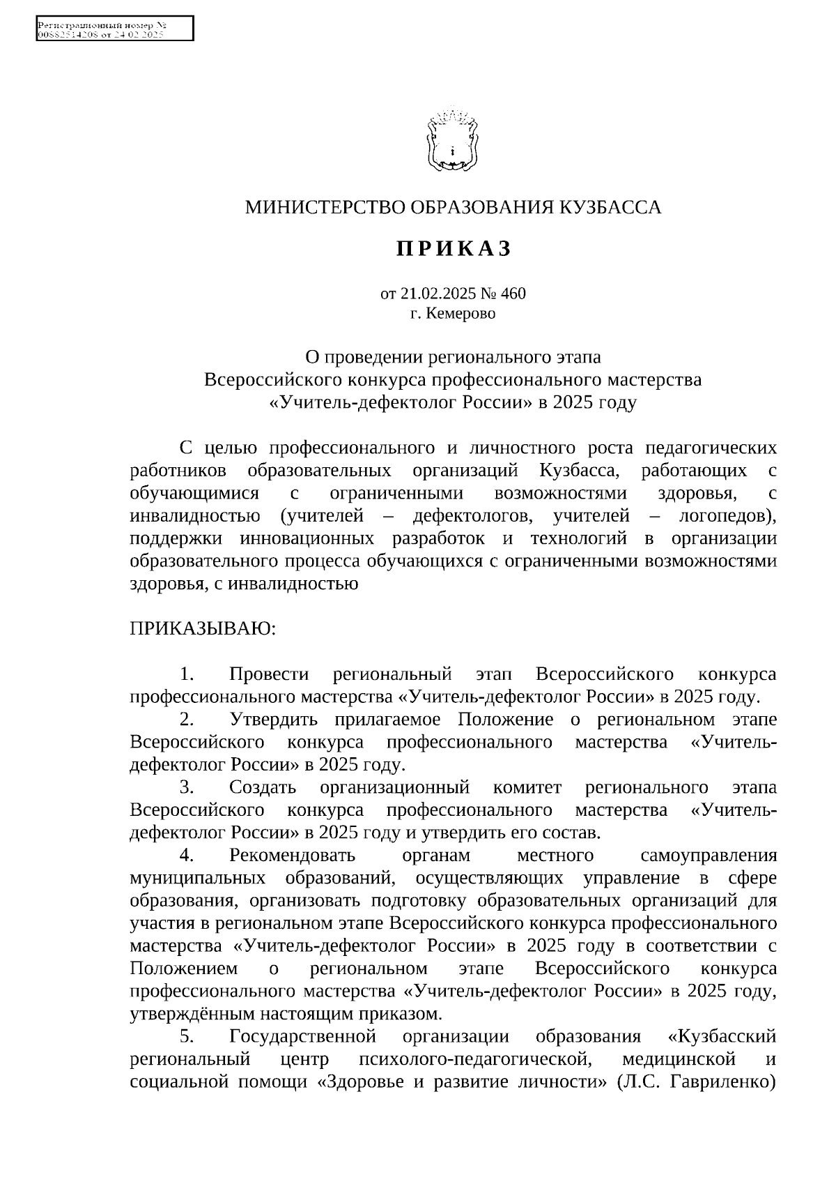 Приказ Министерства образования Кузбасса от 21.02.2025 № 460