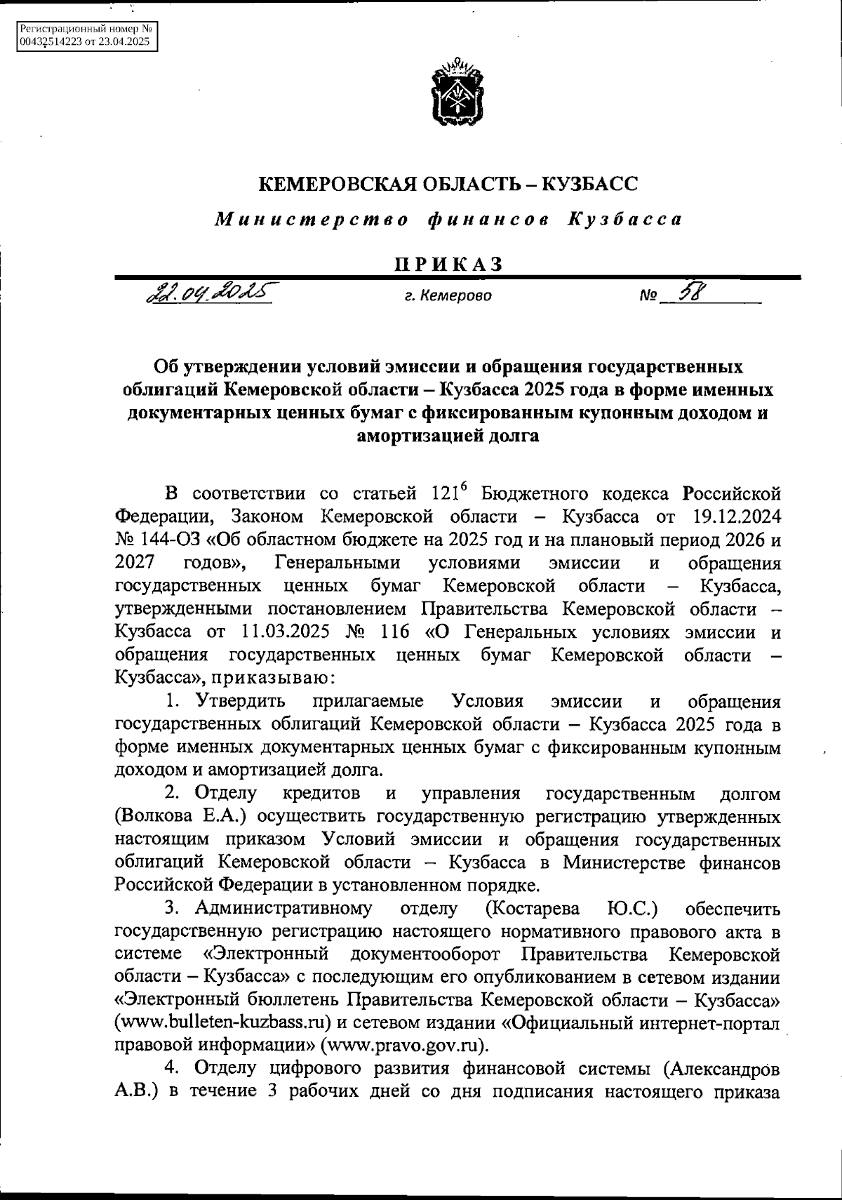 Приказ Министерства финансов Кузбасса от 22.04.2025 № 58