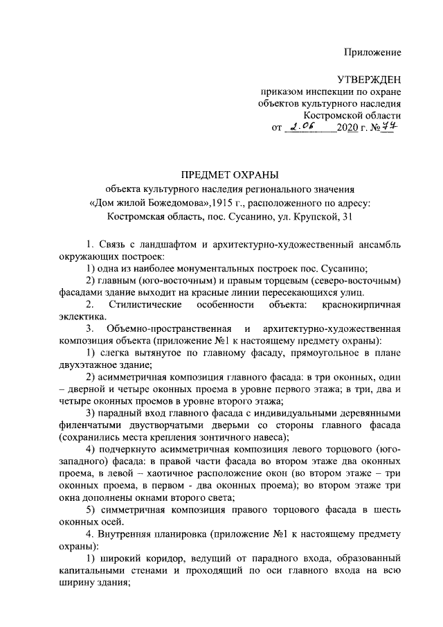 "Об утверждении предмета охраны объекта культурного наследия регионального значения "Дом жилой Божедомова"‚1915 г.‚ расположенного по адресу: Костромская область, пос. Сусанино, ул. Крупcкой, 31"