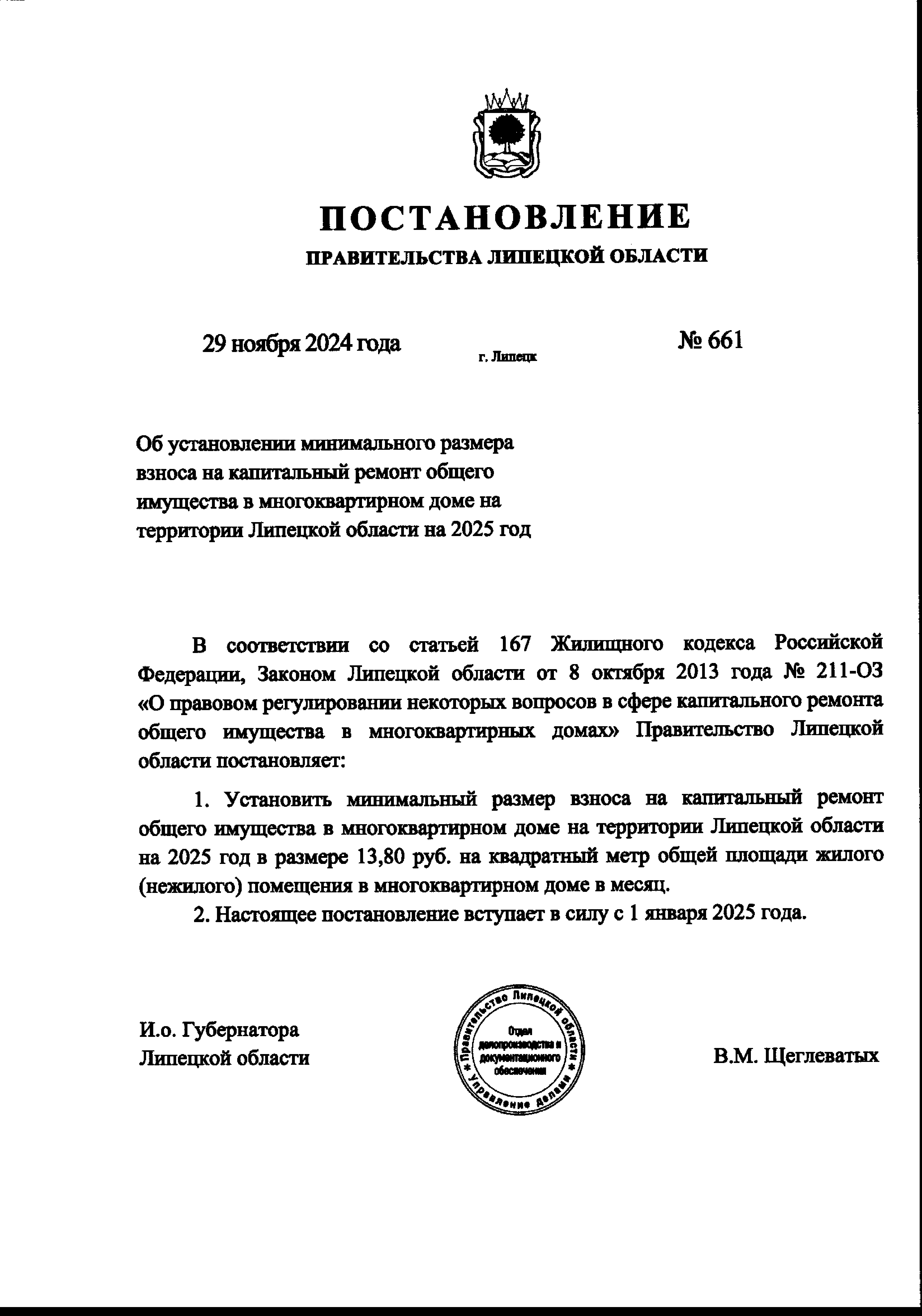 Постановление Правительства Липецкой области от 29.11.2024 № 661